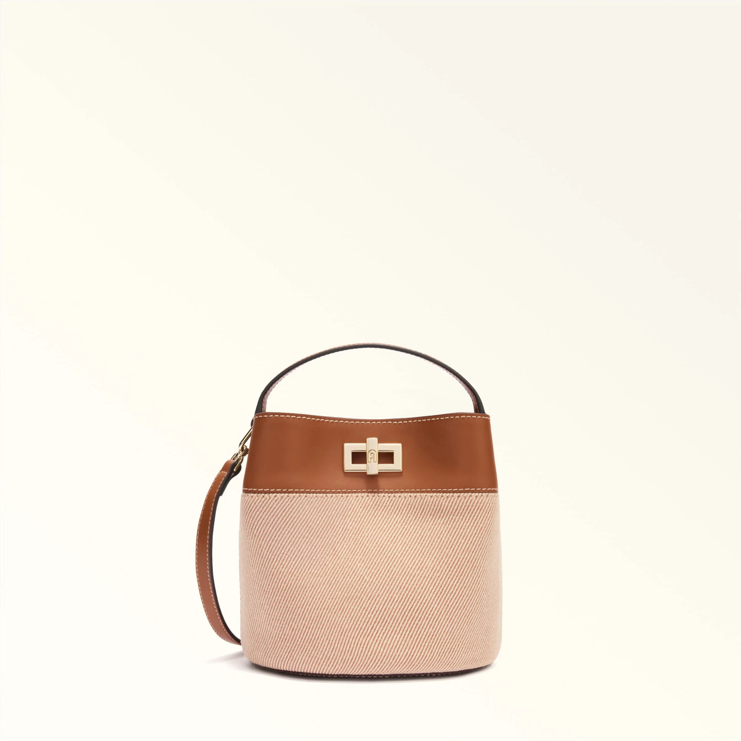 Perfect for the summer season, this mini Furla Amelia bucket bag comes in canvas fabric. Featuring an adjustable and removable leather strap, it can be carried in a variety of ways, and its two inner compartments keep your essentials safe and to hand. - Front compartment with twist closure - Compartment with magnetic closure on the back - D-ring for charms and keys - Punched Furla logo Details Exterior Details: Furla Logo/Single Handle Material: Canvas Fabric + Sidney Calf Leather Strap information: Removable/adjustable leather strap Strap Length Max: 45.67 in Strap Length Min: 40.94 in Product Code: WE00879BX35421007TCO00 Plating: Gold Dimensions in INCH 7,48 x 7,48 x 5,12 (w x h x d)