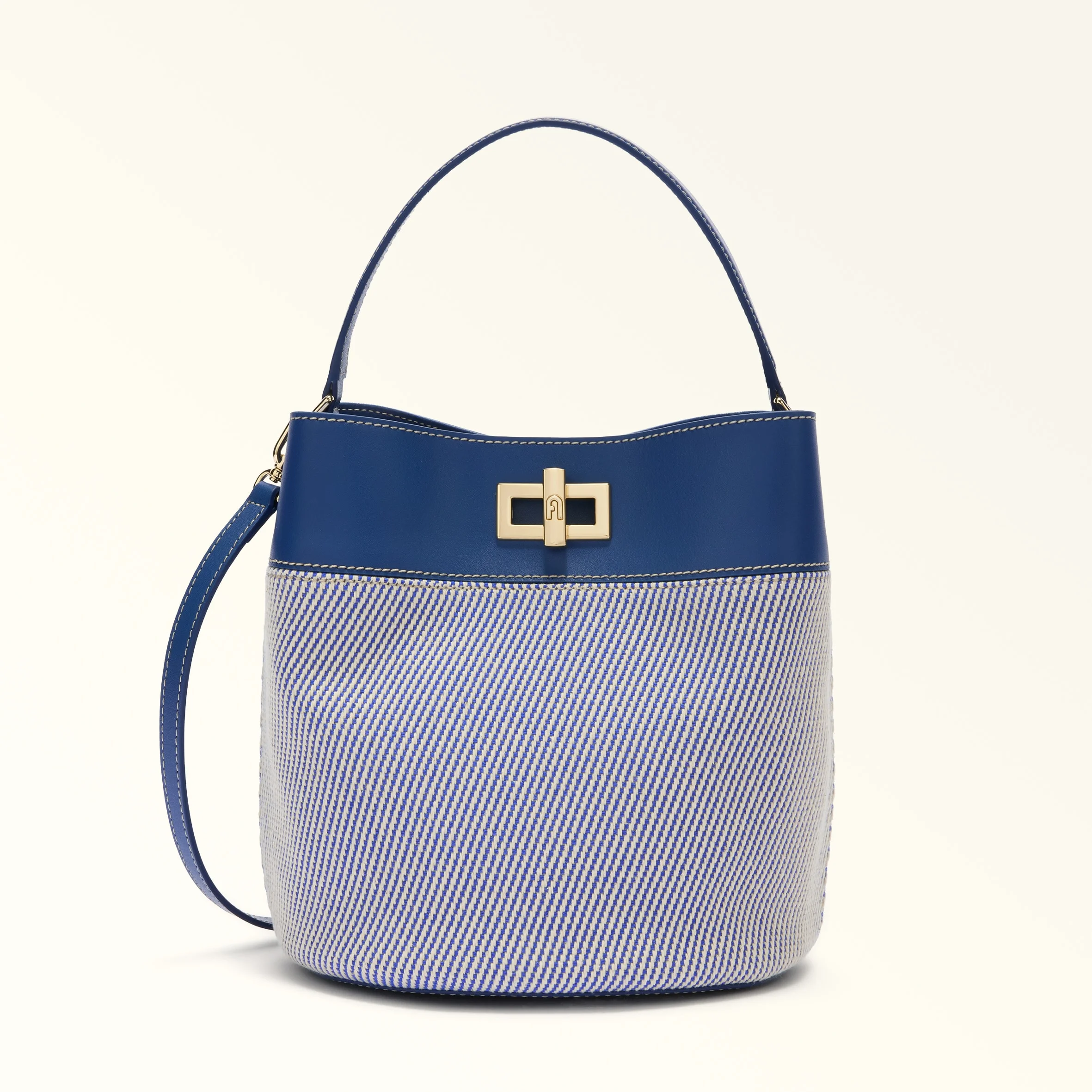 Perfect for the summer season, this spacious Furla Amelia bucket bag comes in canvas fabric. Featuring an adjustable and removable matching strap, it can be carried in a variety of ways, and its two inner compartments keep your essentials safe and to hand. - Front compartment with twist closure - Compartment with magnetic closure on the back - D-ring for charms and keys - Punched Furla logo Details Exterior Details: Furla Logo/Single Handle Material: Canvas Fabric + Sidney Calf Leather Strap information: Removable/adjustable leather strap Strap Length Max: 46.06 in Strap Length Min: 41.73 in Product Code: WB01953BX442110074296S Plating: Gold Dimensions in INCH 8,86 x 9,65 x 7,28 (w x h x d)