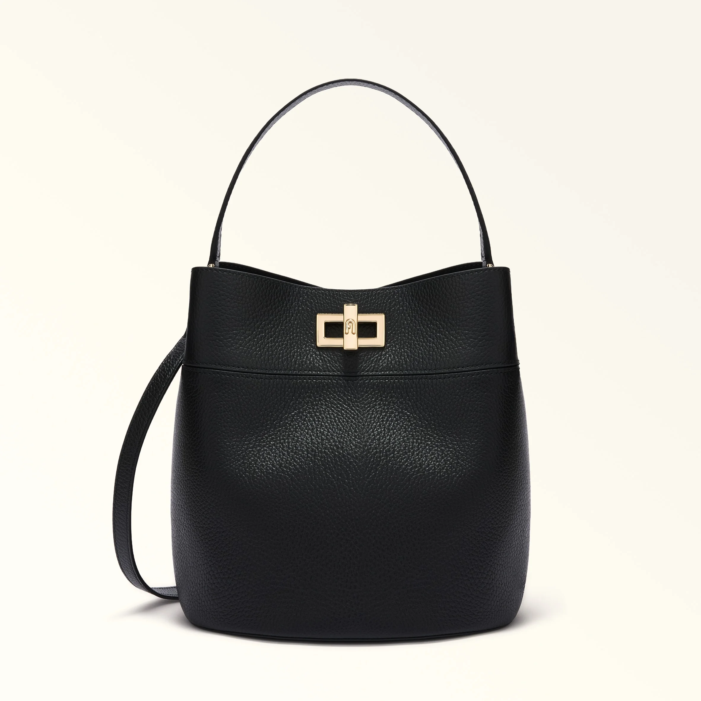 The subtle grained texture on its calfskin leather gives the compact but spacious Furla Amelia bucket bag an easy elegance. Featuring an adjustable and removable strap, it can be carried in a variety of ways, and its two inner compartments keep your essentials safe and to hand. - Front compartment with twist closure - Compartment with magnetic closure on the back - D-ring for charms and keys - Punched Furla logo Details Exterior Details: Furla Logo/Single Handle Material: Grained Calf Leather Strap information: Removable/adjustable leather strap Strap Length Max: 46.06 in Strap Length Min: 41.73 in Product Code: WB01953HSF0001007O6000 Plating: Gold Dimensions in INCH 8,86 x 9,65 x 7,28 (w x h x d)