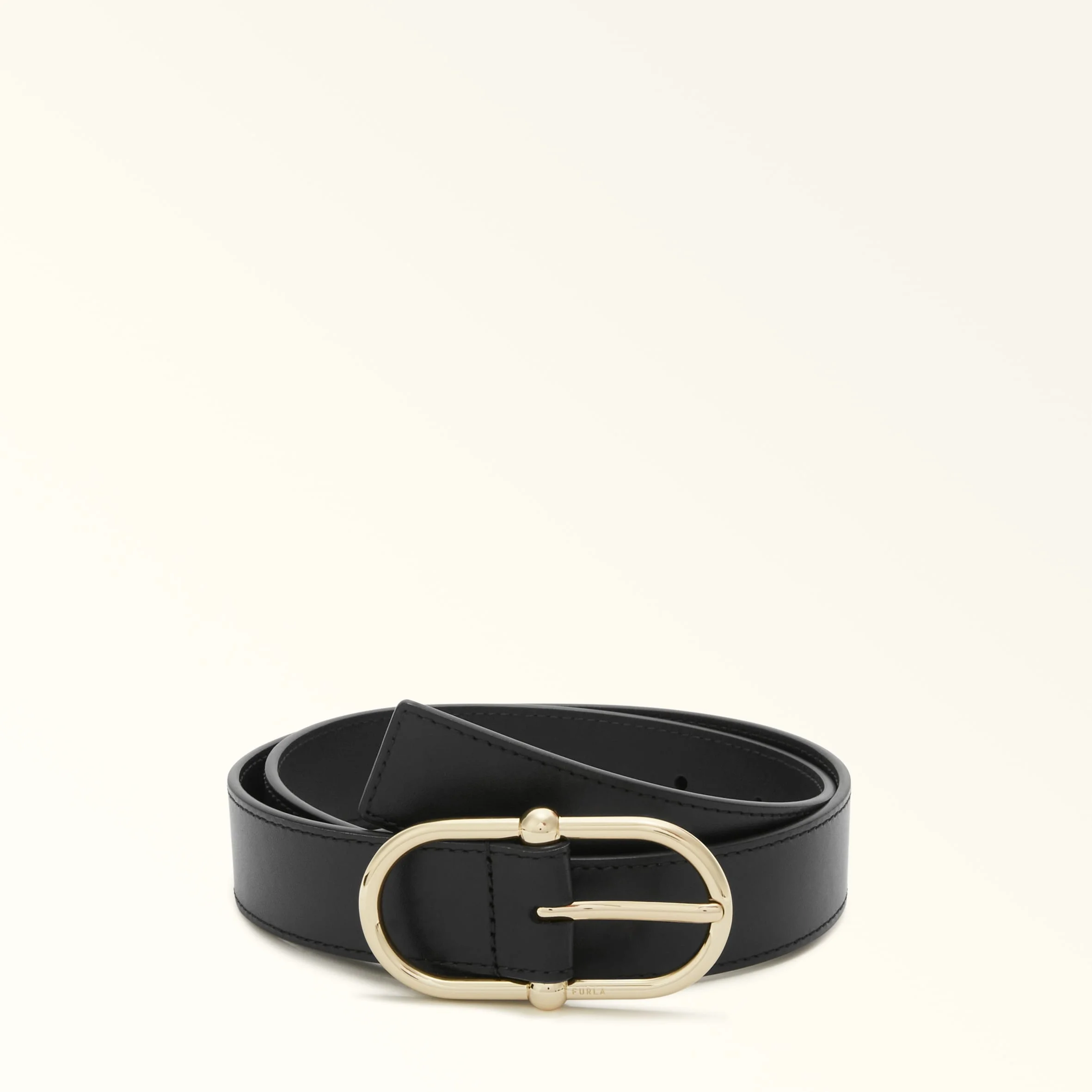 Styled in smooth and elegant leather, this Furla Camelia belt features a distinctive satin-finish buckle with a double Arch logo. It is the ideal finishing touch for any outfit, and the adjustable length means it affords customisable style and fit. - Furla logo engraved on the buckle - 3 cm deep Details Exterior Details: Furla Punched Logo Material: Soft Calf Leather Product Code: WC00077AX07331007O6000 External Composition: 90% Leather 10% Metal Plating: Gold