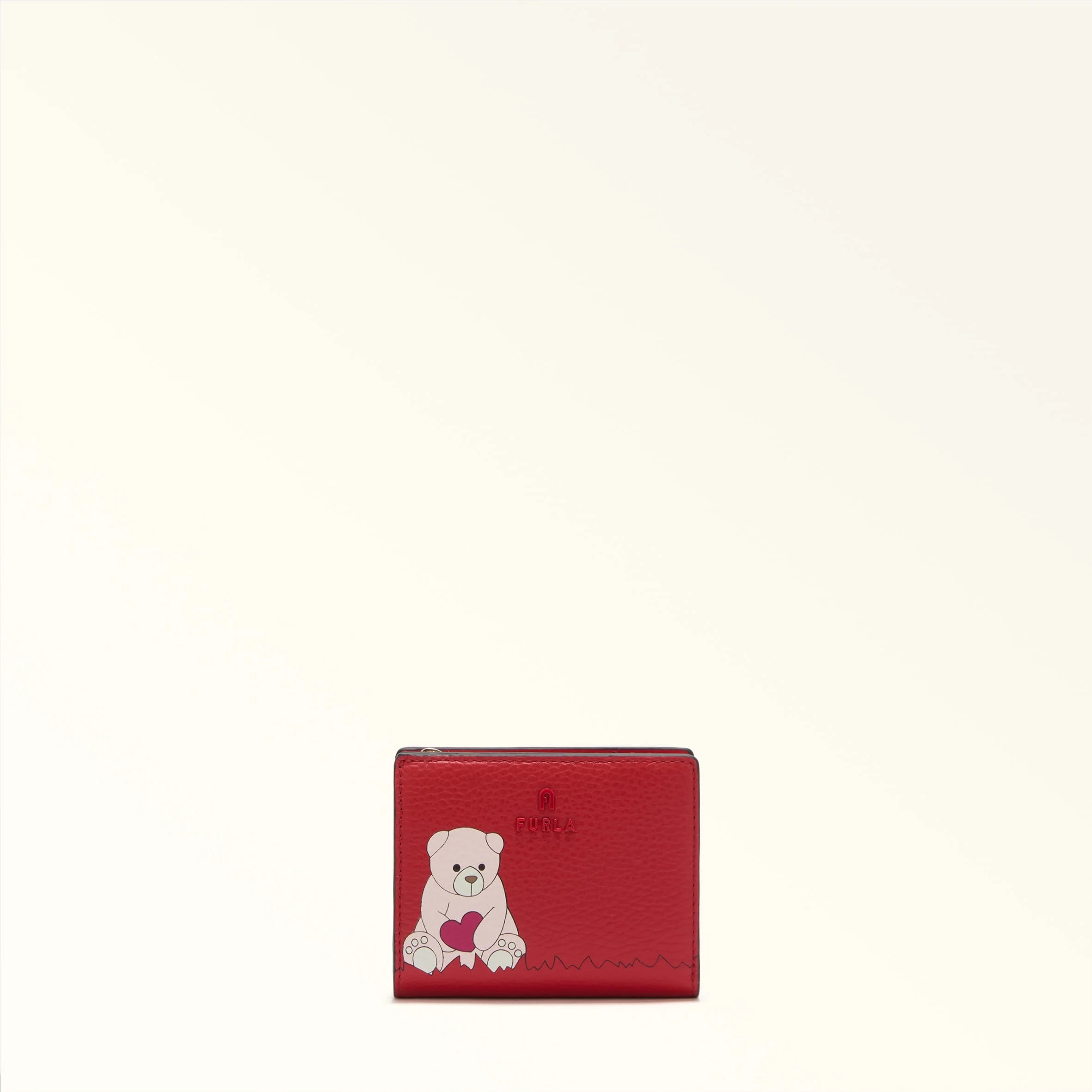 The leather of this Furla Camelia wallet features a light grained texture and a unique, romantic bear-and-heart-print. Its compact size makes it convenient to slip into any mini bag. - Inner banknote compartment - Seven inner credit card slots - Inside coin pocket with zip closure - Press-stud closure - Mini Furla and Arch logos punched on the front Details Interior Details: 7 Cc Slots/1 Banknotes Pocket/1 Zipped Pocket For Coins Material: Eracle Grained Calf Leather with Orso Cuore Print Hardware: Arch+Furla Mini Lettering Product Code: WP00307BX429190014524S Plating: Matching+Light Gold Dimensions in INCH 4,33 x 3,54 x 1,18 (w x h x d)