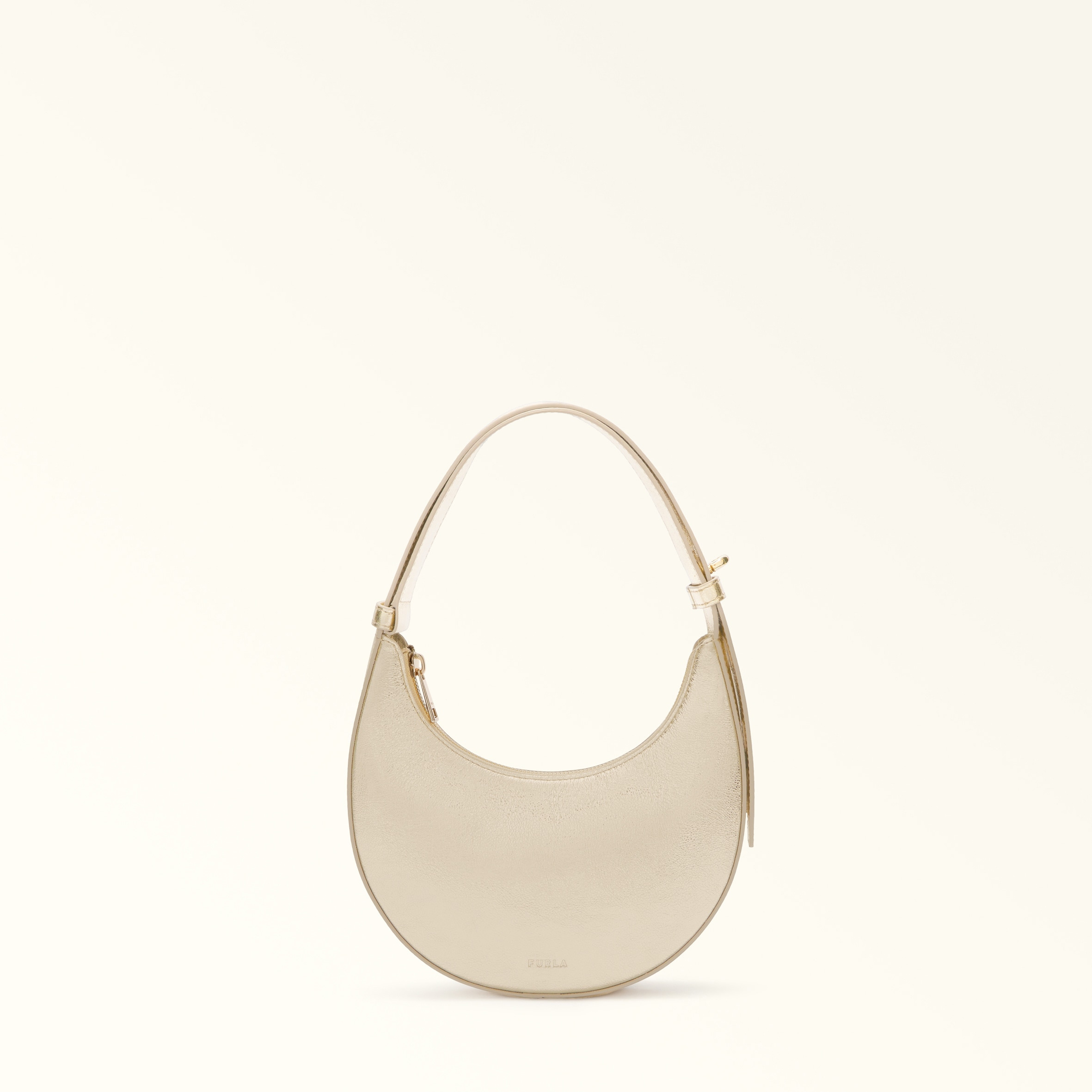 Mini but mighty, the Furla Delizia is just the right size for all your essentials. A concentration of elegance, the bag's sturdy half-moon structure is made of soft metallic leather for a radiant finish and its adjustable strap sits comfortably on your shoulder or in your hand. - Three inner credit card and ID slots - Adjustable shoulder strap with twist-lock system - Top zip closure - Furla logo print on the front Details Interior Details: 3 Cc Slots Exterior Details: Furla Punched Logo Material: Piuma Metal Calf Leather Product Code: WE00649BX41501007VAN00 Plating: Gold Dimensions in INCH 8,27 x 7,48 x 1,18 (w x h x d)