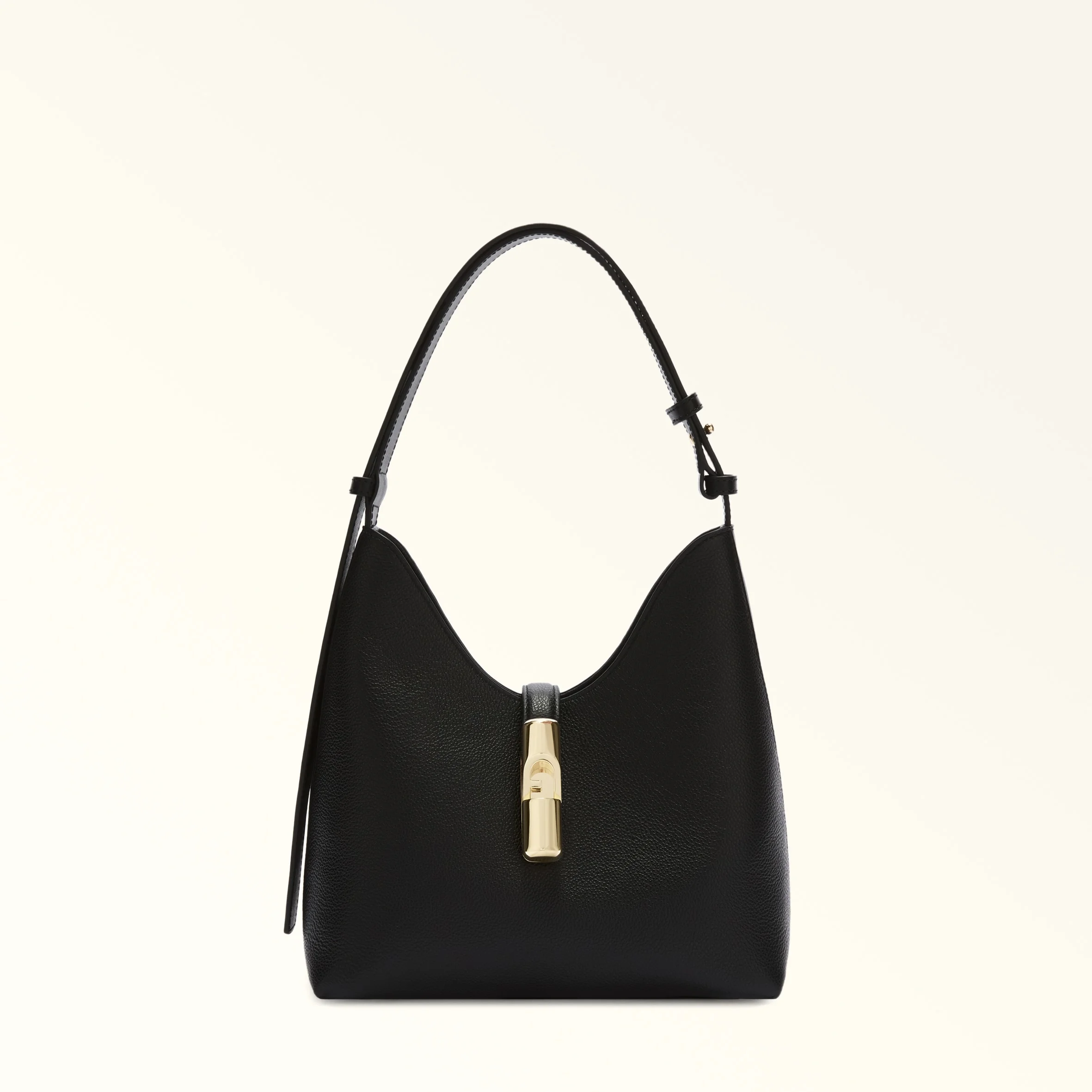 Made from smooth leather and printed calfskin, the Furla Goccia hobo bag stands out for its soft, unstructured shape. The bag is enhanced by a tab matching the adjustable contrasting leather handle. New weighted cylindrical hardware with the Furla Arch logo fastens the accessory with elegance. - Open inside pocket - Inside zip pocket Details Exterior Details: Furla Punched Logo/Single Handle Material: Night Calf Leather Strap Length Max: 35.63 in Strap Length Min: 30.91 in Hardware: Metal Feet Product Code: WB01979BX33531007O6000 Plating: Gold Dimensions in INCH 9,45 x 9,45 x 4,72 (w x h x d)