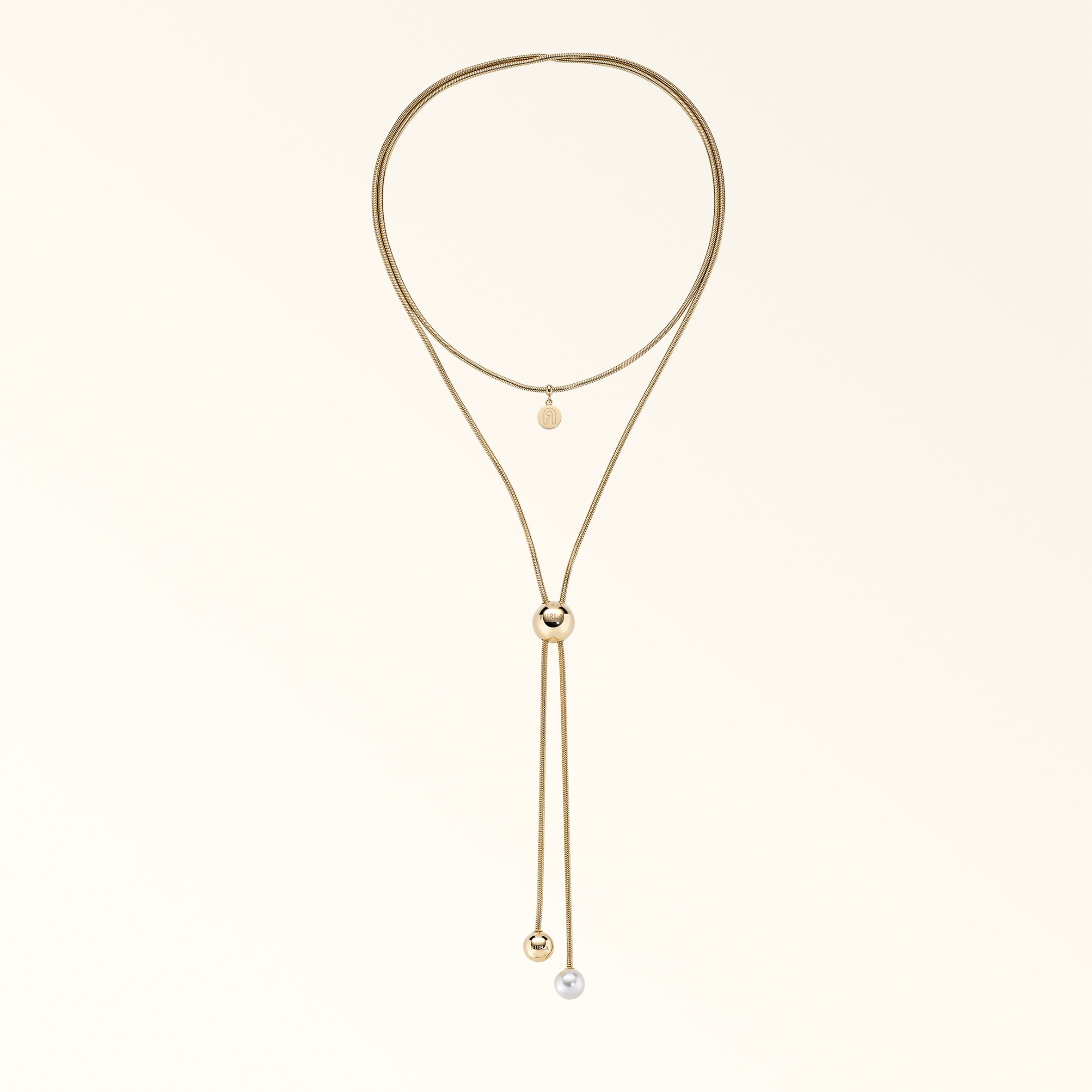 Elegant and geometric, the Furla Miasfera Multisfera necklace falls in an elongated Y shape. Its thin chain is embellished with a larger round element, which slides to adjust the length, and two spherical pendants in contrasting resin and metal finishes. Worn alone or combined with the other jewellery from the same line, it elevates any look with a unique touch. Details Material: Metal + Resin Product Code: WJ00294K220001007OR000 Plating: Gold