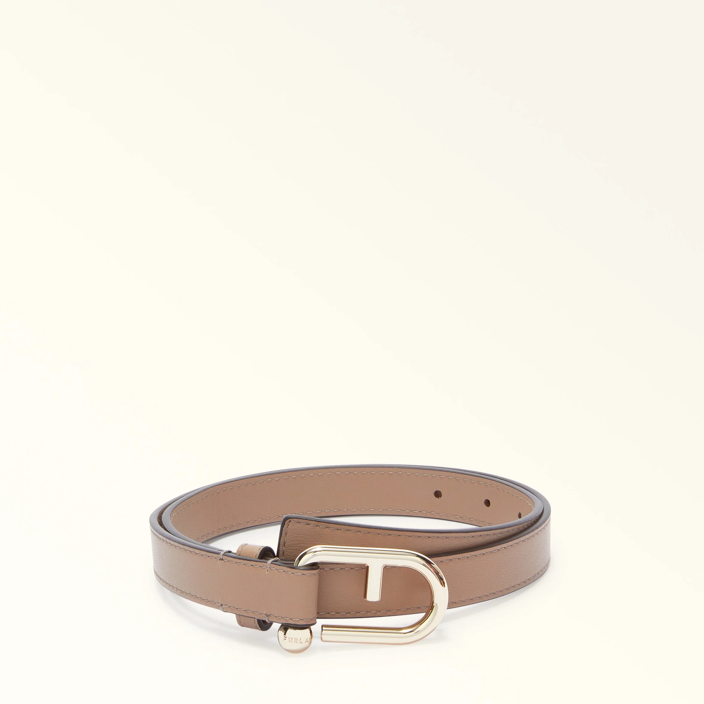 This slim and elegant Furla Nuvola belt is crafted in luxurious grained leather and adds a contemporary touch to any outfit. It features a satin-finish buckle with the new interpretation of the Arcosfera hardware, which combines the iconic Furla Arch logo and the original round element of the brand. - Stud buckle - 2 cm deep Details Exterior Details: Furla Punched Logo Material: Claris Lux Calf Leather Product Code: WC00089BX204510071257S External Composition: 95% Leather 5% Metal Plating: Gold
