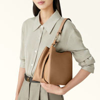 Simple and elegant lines for this new Furla Nuvola bucket bag. Soft and lightweight, it is styled in fine grained leather with a rich and luxurious feel. The small size is comfortable to carry whether in the hand or on the shoulder thanks to the adjustable buttoned handle, made distinctive by the Arcosfera hardware that brings the iconic Furla Arch logo together with the original round element of the brand. - Two open inside pockets - Inside zip pocket - Magnetic button closure - Furla logo punched on the back Details Interior Details: 2 Flat Open Pockets/1 Zipped Pocket Exterior Details: Furla Punched Logo/Single Handle Material: Grained Calf Leather Strap information: Fixed/Adjustable Leather Strap Closure: Magnet Closure Hardware: Furla Arch Ring Cufflinks For Regolation Product Code: WB01373HSF0001007YU500 Internal Composition: 50% Nylon 50% Polyurethane External Composition: 100% Leather Plating: Gold Dimensions in INCH 7,68 x 7,87 x 5,51 (w x h x d)