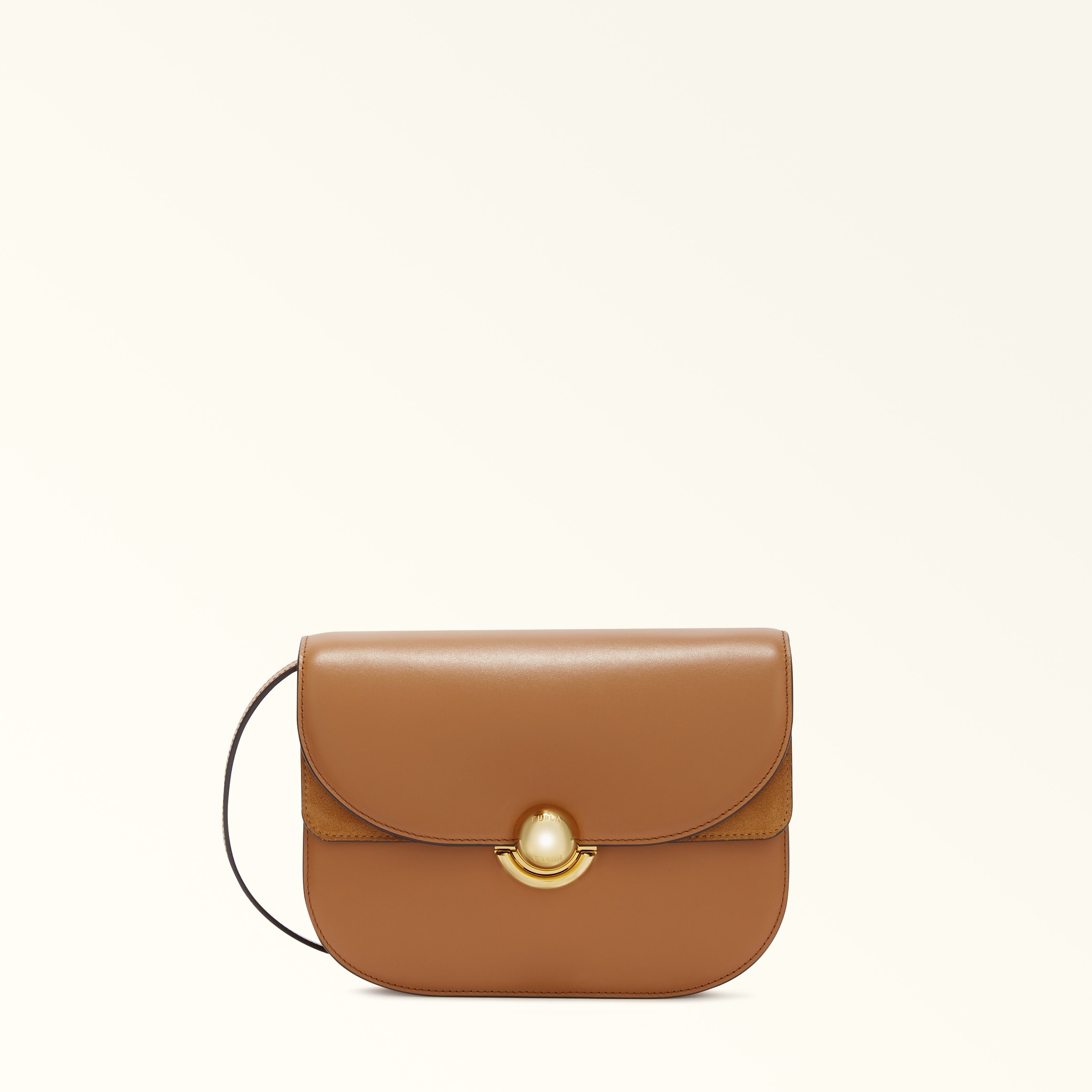 The sleek lines and saddle silhouette of this bag make it elegant and distinctive. The small Furla Sfera piece has a matching adjustable shoulder strap and can be comfortably worn crossbody or on the shoulder. Styled in luxurious smooth leather, it is finished with soft suede details on the inner flap, and the clean and simple new round Sfera closure, the iconic signature of the Furla brand. - Open inside pocket - Inside zip pocket - Open inside pocket on front panel - Flap closure Details Exterior Details: Furla Logo/Single Handle Material: Soft Calf Leather + Suede Strap information: Removable/adjustable leather strap Strap Length Max: 46.85 in Strap Length Min: 40.16 in Closure: Boule Lock Product Code: WB01355BX04281002RY000 Internal Composition: 40% Nylon 40% Polyurethane 20% Polyester External Composition: 100% Leather Plating: Polished Bronze Dimensions in INCH 9,45 x 5,91 x 3,35 (w x h x d)