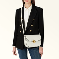 The sleek lines and saddle silhouette of this bag make it elegant and distinctive. The small Furla Sfera piece has a matching adjustable shoulder strap and can be comfortably worn crossbody or on the shoulder. Styled in luxurious smooth leather, it is finished with soft suede details on the inner flap, and the clean and simple new round Sfera closure, the iconic signature of the Furla brand. - Open inside pocket - Inside zip pocket - Open inside pocket on front panel - Flap closure Details Exterior Details: Furla Logo/Single Handle Material: Soft Calf Leather + Suede Strap information: Removable/adjustable leather strap Strap Length Max: 47.24 in Strap Length Min: 39.76 in Closure: Boule Lock Product Code: WB01355BX04281002PNN00 Internal Composition: 40% Nylon 40% Polyurethane 20% Polyester External Composition: 100% Leather Plating: Polished Bronze Dimensions in INCH 9,45 x 5,91 x 2,95 (w x h x d)