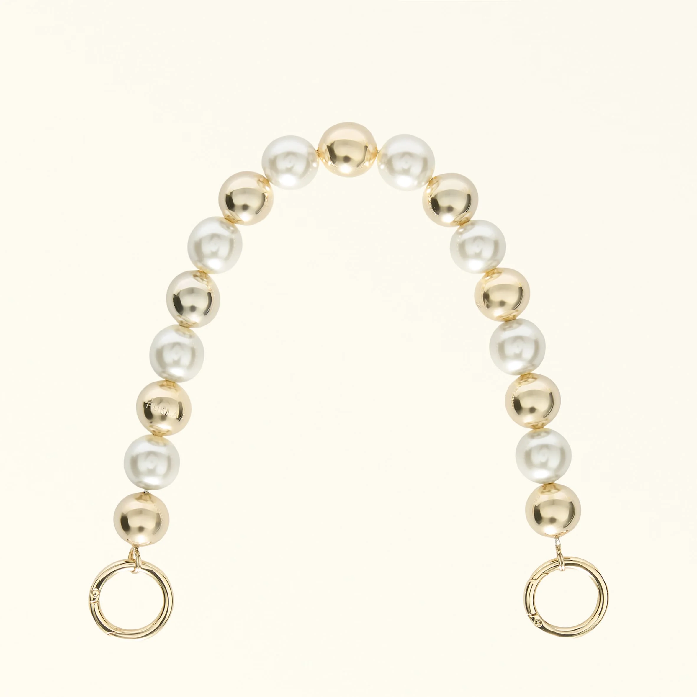 The Furla MyFurla handle is made up of Sfera elements in metal and pearlescent resin. Designed to hook onto your bags, the accessory also features small rings for adding extra charms and unique details. - Snap hook on the ends - Engraved Furla logo Details Exterior Details: Furla Logo Material: Metal + Pearl Effect Resin Strap Length Max: 16.34 in Strap Length Min: 16.34 in Product Code: WK00277BX438090194343S Plating: Light Gold+Pearl
