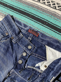Size 31 waist : 15.5" (edge to edge) outseam : 43.5" inseam : 33" front rise : 8.5" back rise : 14.5" leg opening : 8.5" Good condition