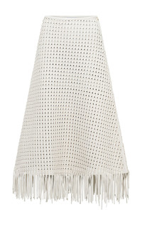 The beautifully handwoven white nappa leather of the Bennie Skirt reimagines a classic GH silhouette—elevated with a sense of rawness through its hand-cut fringe at the sweep. Designed to pair seamlessly with the Odin Bomber Jacket. Details: - 100% Lambskin Leather - High-rise - Fringe hem - Made in Italy