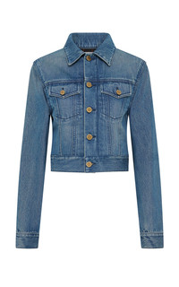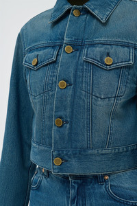 The Bronte Jacket is a cropped denim jacket made from recycled cotton. It features a classic pointed collar, long sleeves, and front flap pockets. The fitted shape is accented with structured seams and finished with metal buttons down the front. Details: - 100% - recycled cotton - Cropped length - Pointed collar - Front button closure - Chest flap pockets with buttons - Long sleeves - Italian sizing - Made in Italy