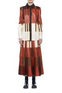 The utilitarian styled Campos Shirt is pieced together in nappa and suede degrade panels. This engineered design is beautifully executed through the use of a traditional marquetry technique. This carefully formatted design flows seamlessly into the pattern mirrored on the Mayita skirt. These pieces are beautiful when worn as a set but can also be worn unbuttoned over a t-shirt with a trouser or jeans for an easy look. Details: - Hidden front placket button closure - 100% Lamb Leather - Made in Italy - Product Details Size and Fit: Fits true to size. Model is 5'11"" and wearing a size Small.