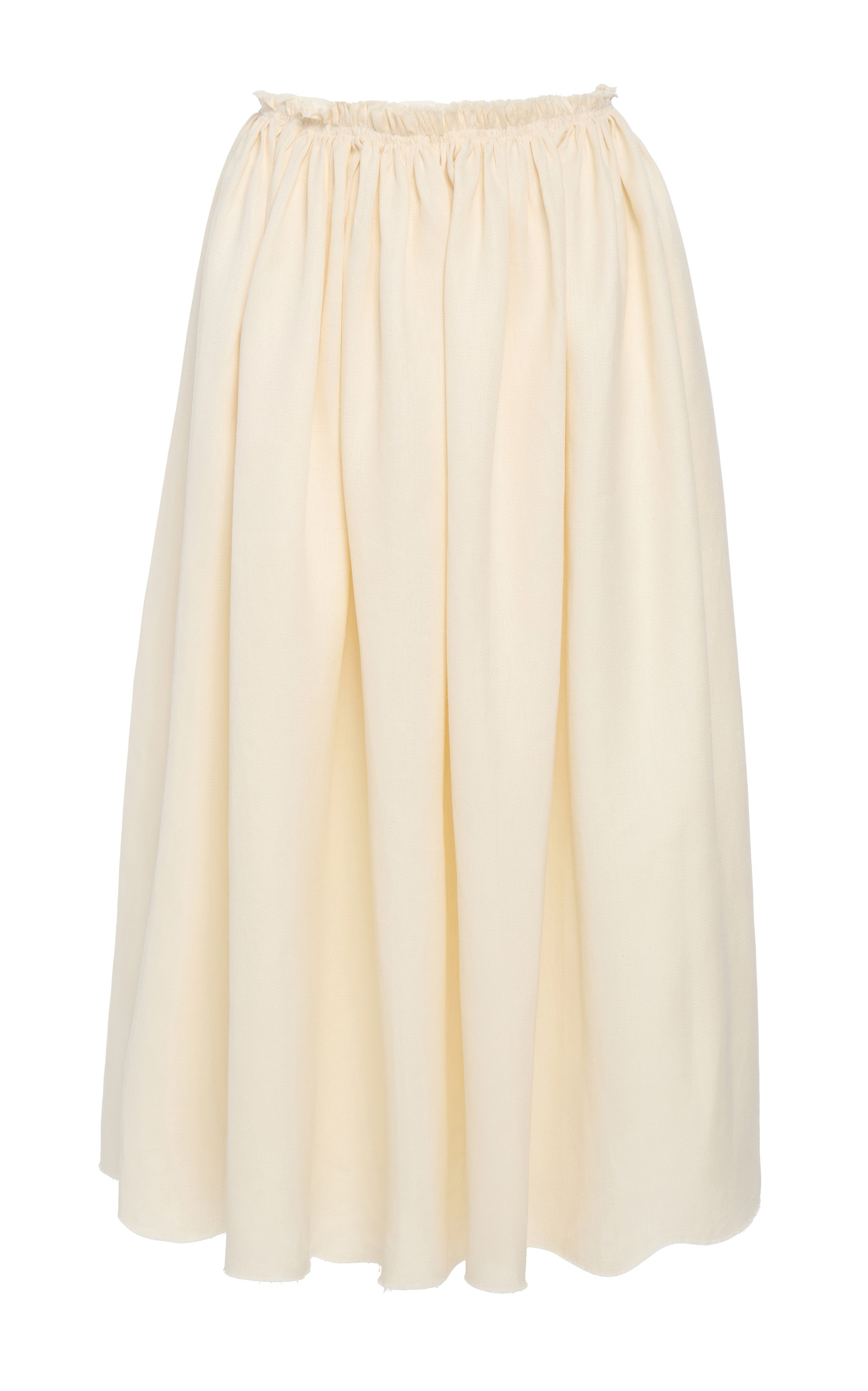 The Chiara Skirt is created with a fine multi-tucking detail at the waistband to create a full but flattering shape. Crafted from richly textured linen slub, the fabric’s natural character enhances the synergy of design and material. Details: - 100% Linen - Dual pockets - Pleated detail - Raw edge waist detail - Midi Length - Made in Italy Size and fit: Standard fit. Fits true to size. Model is 5'11" and wearing a size IT 38.