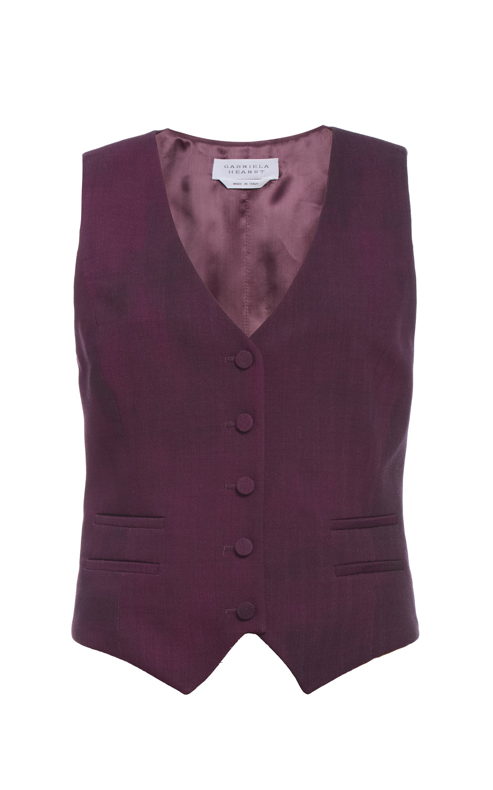 The Coleridge Vest gives a fresh update to three-piece dressing. Made in 100% textured barre wool suiting to capture the vivid abstract paintings from Gabriela's personal sketchbook. This style is traditionally tailored and finished with a center-front button fastening. With double welt pockets and traditional buckle detail at center-back. This season it creates a suit with the Leiva Blazer and the Vesta Pant. Details: - 100% Virgin Wool - Button-up - Self-covered buttons - Back-buckle fastening - Double-welt pockets - Sleeveless - Italian sizing - Made in Italy Size and Fit: Standard fit. Fits true to size. Model is 5'11" and wearing a size 38.