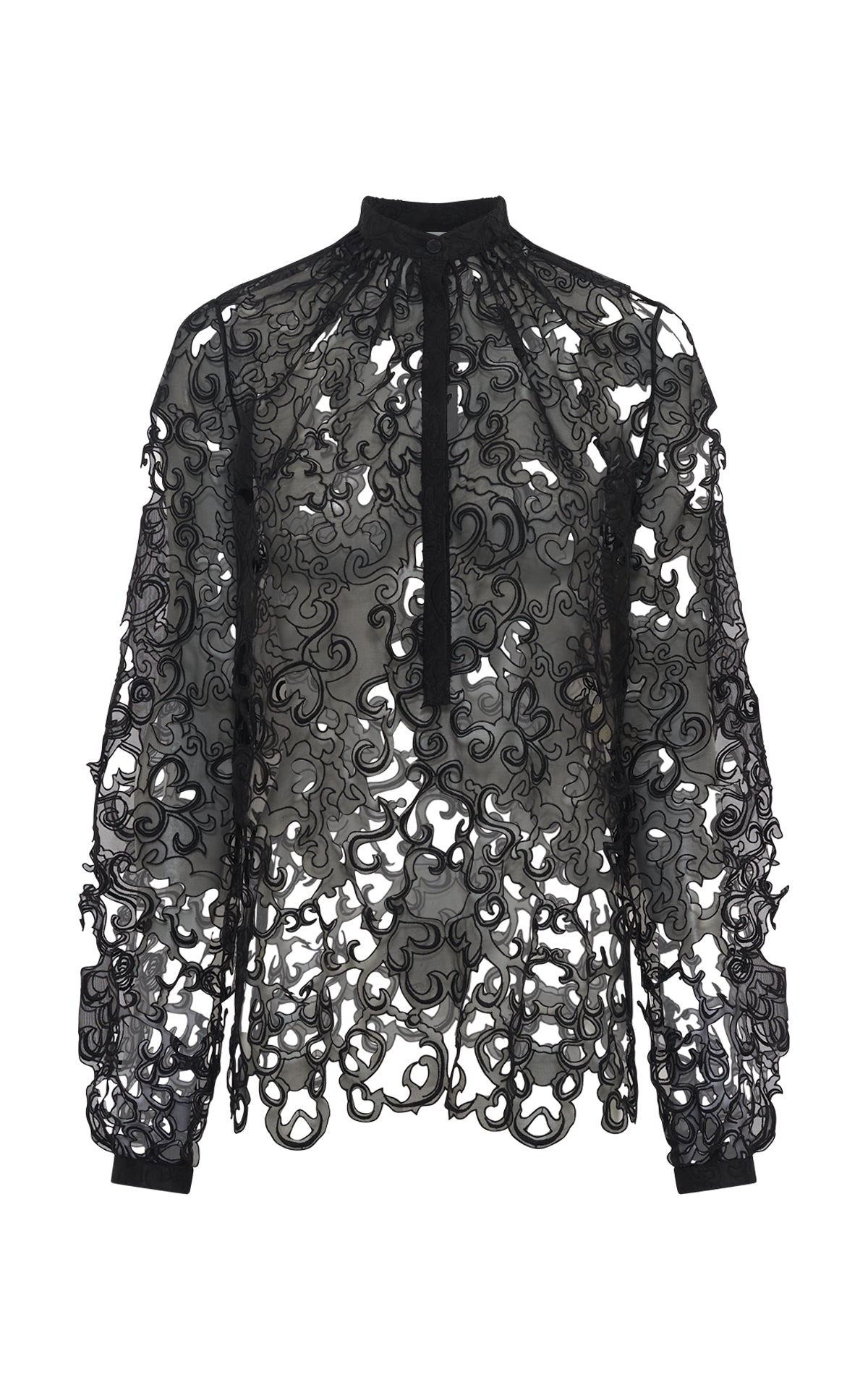 The Dietrich Blouse features a swirling, romantic motif with textural cutouts nodding to the inspiration from the work of archaeologist Marija Gimbutas, who illuminated the power and prominence of goddesses in prehistoric European, matrilineal societies, the collection channels the spirit of these ancient figures. Sculptural shapes, motifs, and forms echo the grace and strength found in goddess artifacts. Details: - 100% Silk - Embroidery: 90% Cotton, 10% Polyester - High neckline - Gathered neckline detail - Concealed button closure - Scalloped hem with embroidered edgework - Button cuffs - Made in Italy