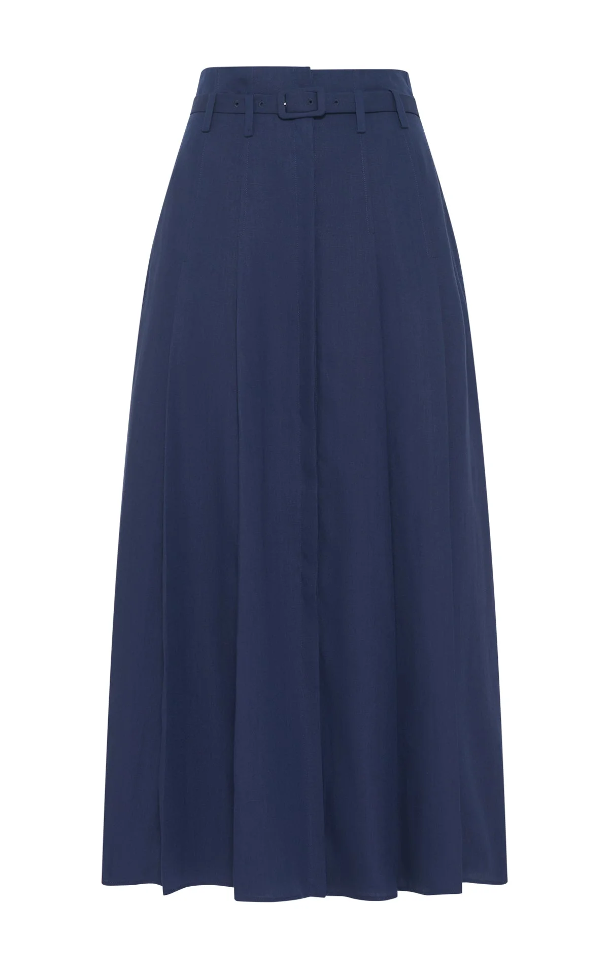 The Dugald linen skirt offers the perfect balance of ease and elegance in a hidden-placket, button-front style. A multi-pleat detail front and back opens up with movement and flare, contrasting to the fitted waist with self-belt and buckle. Details: - 100% Linen - Pleated - High rise - Lightweight, non-stretch - Hidden pocket fastening - Midi-length hem - A-line silhouette - Made in Italy