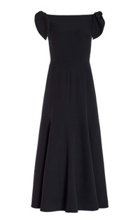 The Eda off-the-shoulder dress offers the idea of a slim-fitted, feminine style in silk wool cady. Beautifully finished and detailed with our signature knot-tie fastening at the shoulders. Details: - 100% Silk - Made in Italy Size and Fit: Fits true to size. Model is 5'11" and wearing a size 38.