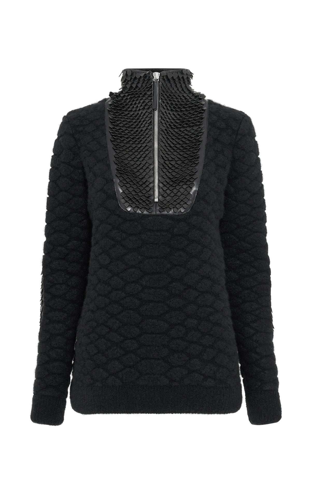 The Isha Sweater in cashmere offers the soft and supple knit coupled with the structured and raw leather funnel neck, both the cashmere and leather detailed to mimic snakeskin, as themed in the collection echoing the work of goddess archaeologist Marija Gimbutas Details: - 100% Cashmere - Mock-neck - Front zipper closure - Italian sizing - Made in Italy