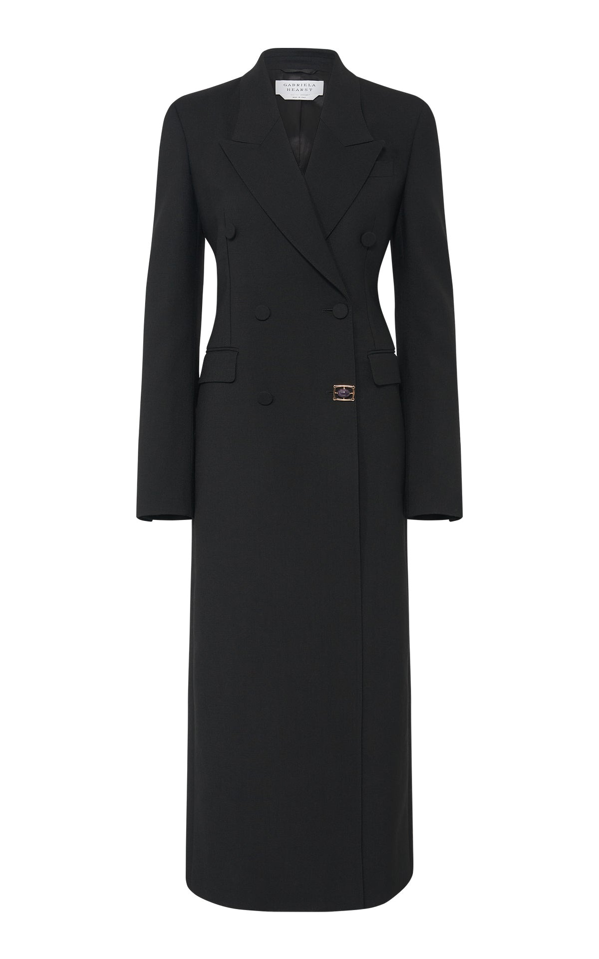 The Julien Coat, crafted in 100% certified recycled RWS wool suiting, makes a bold statement with its structured, double-breasted blazer silhouette. Designed to elongate the figure and enhance feminine form, featuring signature Gabriela Hearst Amethyst hardware at the closure. Details: - 100% RWS Wool - Double-breasted - Dual lapels - Dual pockets - Maxi Length - Amethyst hardware - Made in Italy