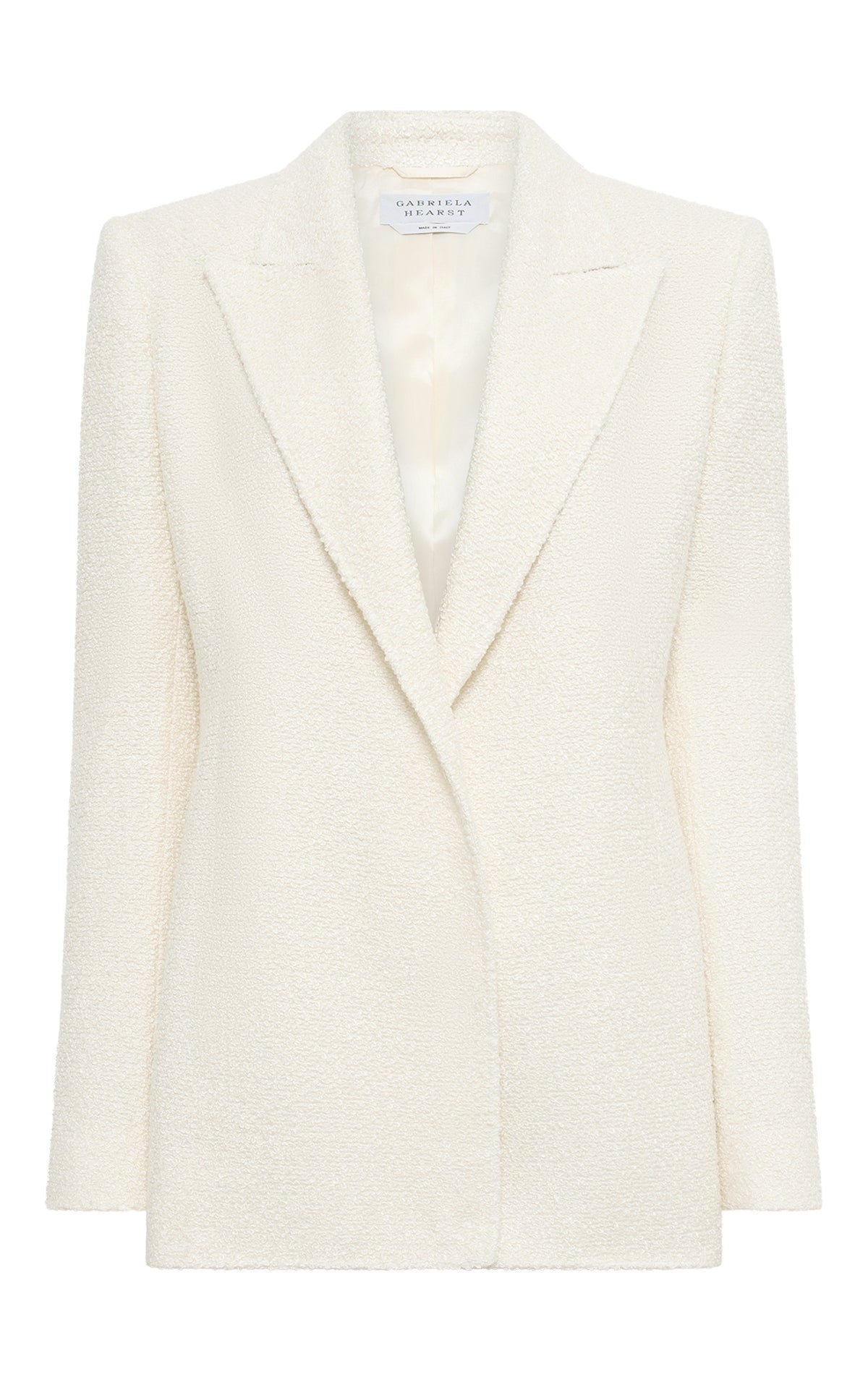 In Ivory silk summer boucle the structured Mairi blazer offers a classic clean finished form with strong shoulder and slim, easy body shape, devoid of closure. Details: - 100% Silk - Peak Lapels - Button Cuffs - Fitted - Double-vented back - Made in Italy