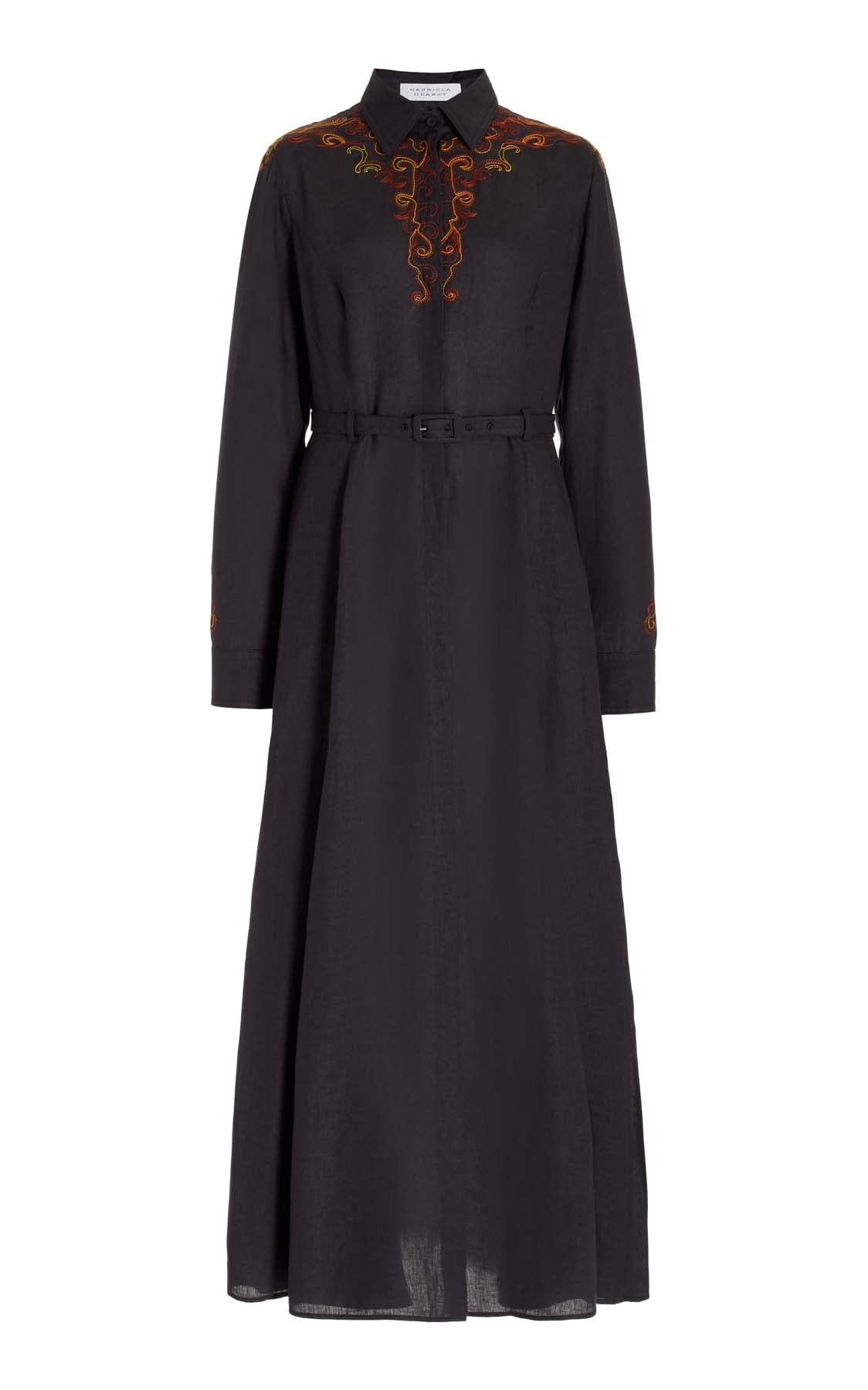 The McGraw dress in Aloe linen shirting combines the idea of a classic button-down shirt style dress with edge-stitched collar, cuffs and centre -front placket, complimented by an intricate stitchwork detail pattern running across the upper neckline. Gently fitted through the upper body and hips with a subtle flare towards the sweep. Details: - 100% Linen - Made in Italy Size and Fit: Fits true to size. Model is 5'11" and wearing a size 38.