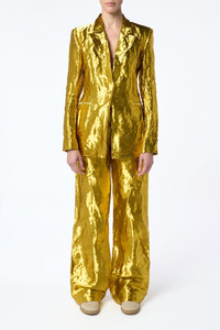 The soft woven Mick blazer is formed from woven metal fabricated from a unique blend of 96% copper and 4% silk to create a fabric that resembles pure gold cloth. A deep V neckline and slim fit through the sweep completes this perfect statement piece. Details: - 96% Metallic Fiber 4% Silk - Single-breasted - Dual pockets - Dual Lapels