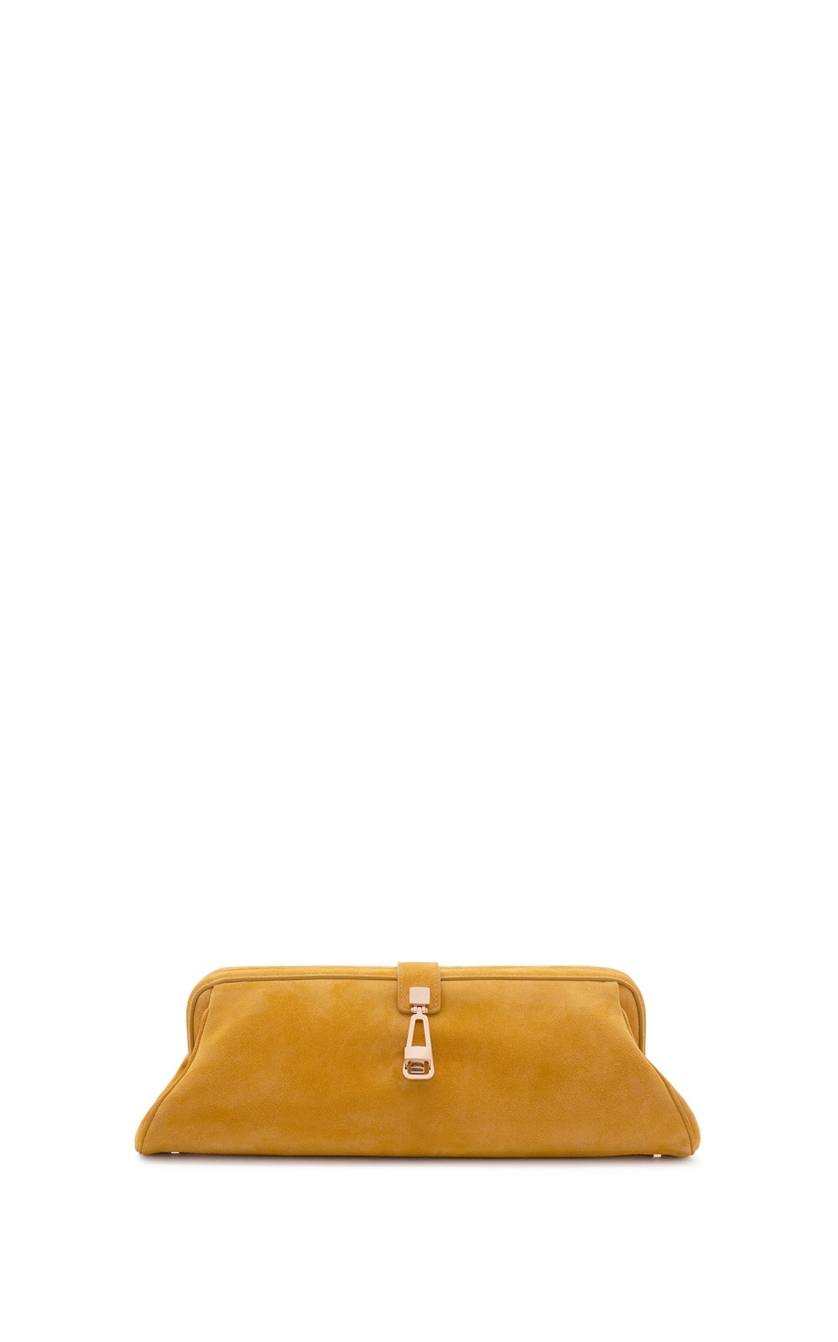 Crafted in suede, this structured baguette silhouette is refined by soft curves and a distinctive metal clasp. Designed for versatility, it can be carried by hand or worn over the shoulder. Details: - 100% Leather - Height: 4.5'' - Length: 13'' - Width: 5'' - Structured top with turnlock closure - Removable shoulder strap with internal hooks - Can be worn as a clutch or shoulder bag - One compartment - One internal slip pocket - Fits an iPhone - Made in Italy In the interest of maintaining our brand values of sustainability, the Paola Clutch in Golden Birch Suede is produced in limited quantities and is available by special order only. To order your bag, please complete the following form and click the “Inquire” button. You will be notified when your item becomes available. For any inquiries please contact us at customercare@gabrielahearst.com or call +1 212 966 2484 Monday through Friday, 9:00 AM to 6:00 PM EST