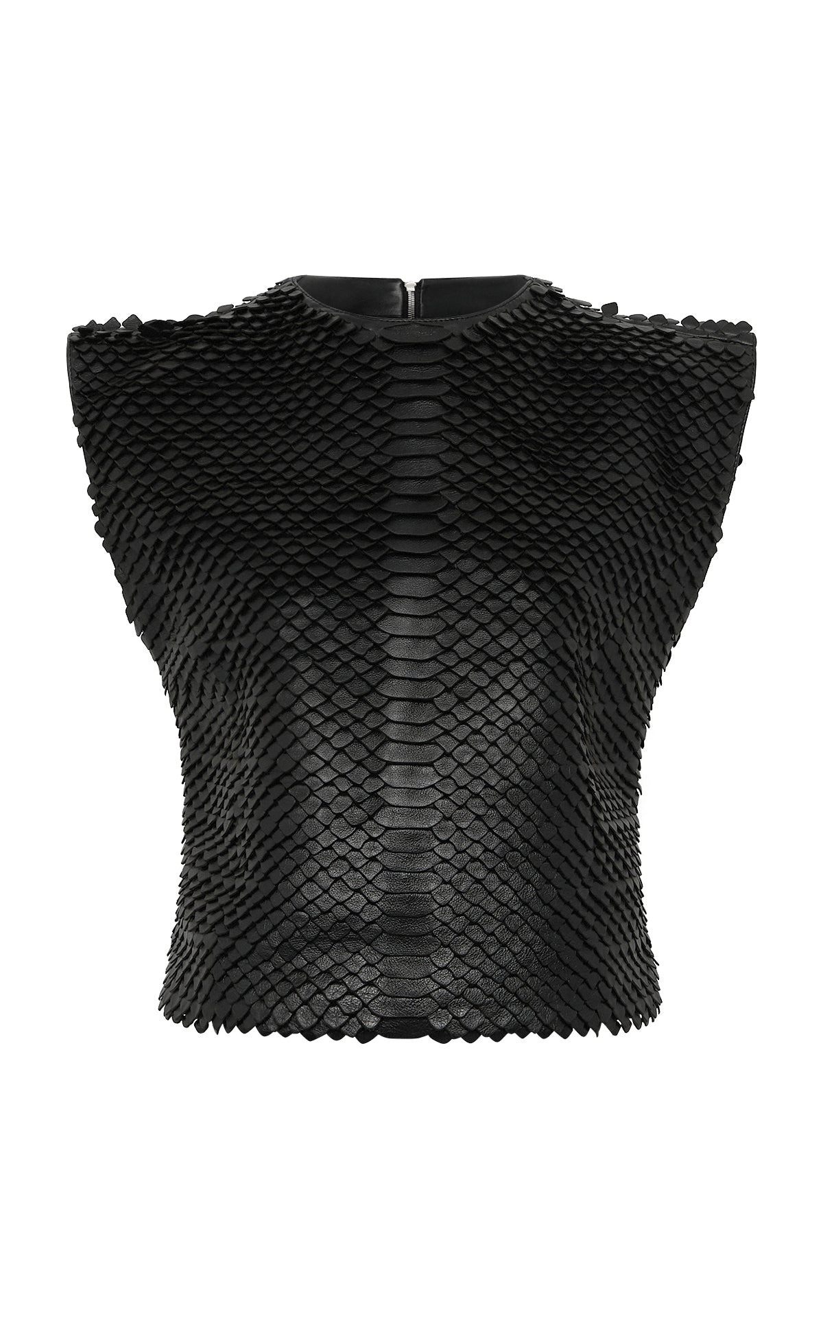 In the work of archaeologist Marija Gimbutas, the snake was revered in ancient European homes as a sacred emblem of good fortune, regeneration, prosperity, and fertility. The Pardee Jacket is nappa leather engineered to look like snake scales Details: - 100% Calf Leather - Sleeveless silhouette - Back zip close - Crew neckline - Made in Italy