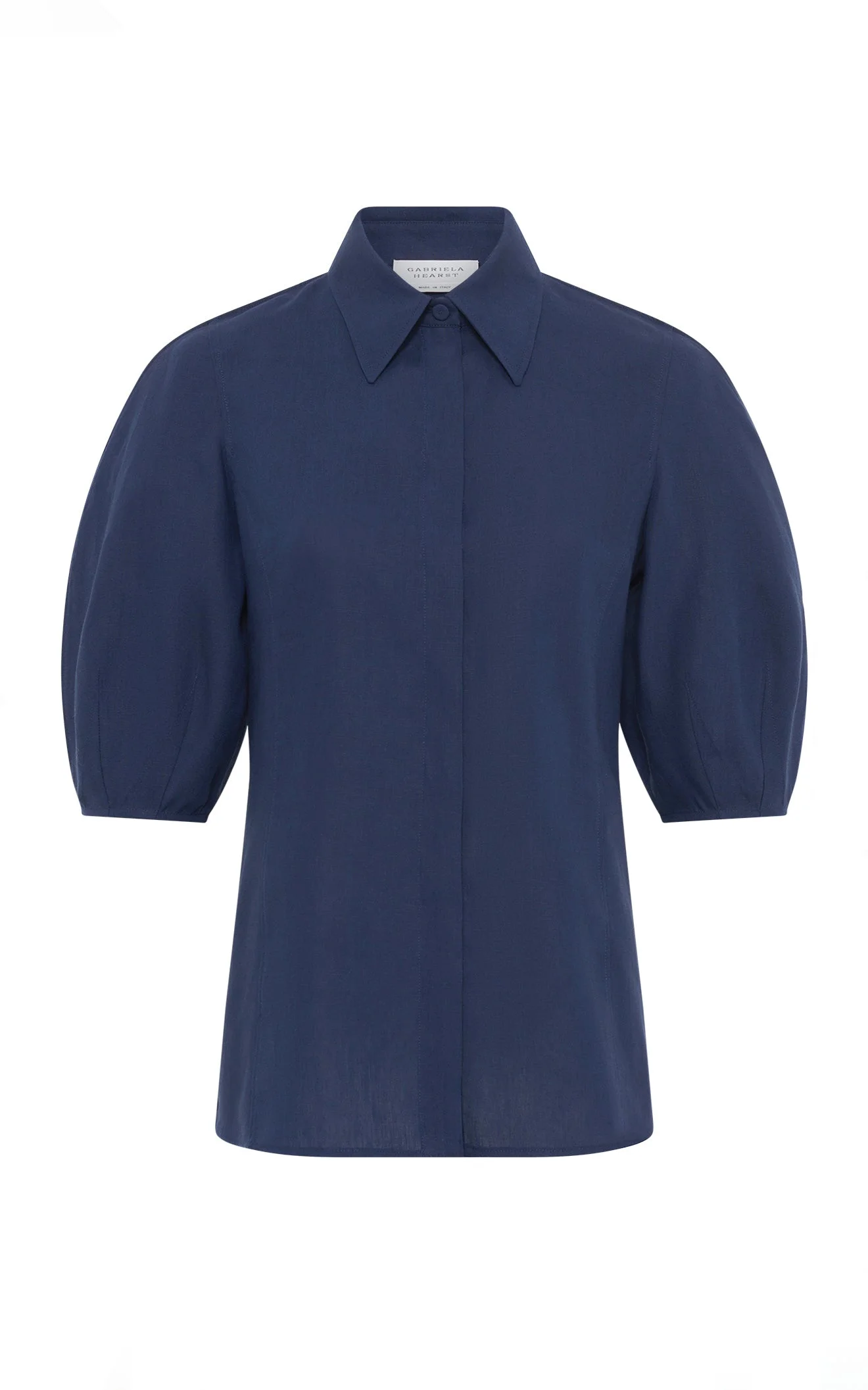 The Sansi top in aloe linen combines a classic button-down shirt complete with a center-front placket and beautifully sculpted full sleeve that ends at the elbow. Details: - 100% Aloe Linen - Point collar - Sculpted sleeves - Concealed button-down - Relaxed fit - Made in Italy