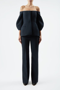 The off-the-shoulder Sawyer Jacket boasts a full sculpted sleeve constructed with darts, constrasting dramatically against the fitted bodice and hips. A single, self-button fastening completes this style. Crafted in luxurious wool silk cady. Details: - 77% Wool, 23% Silk - Made in the Italy Size and Fit: Fits true to size. Model is 5'11" and wearing a size 38.