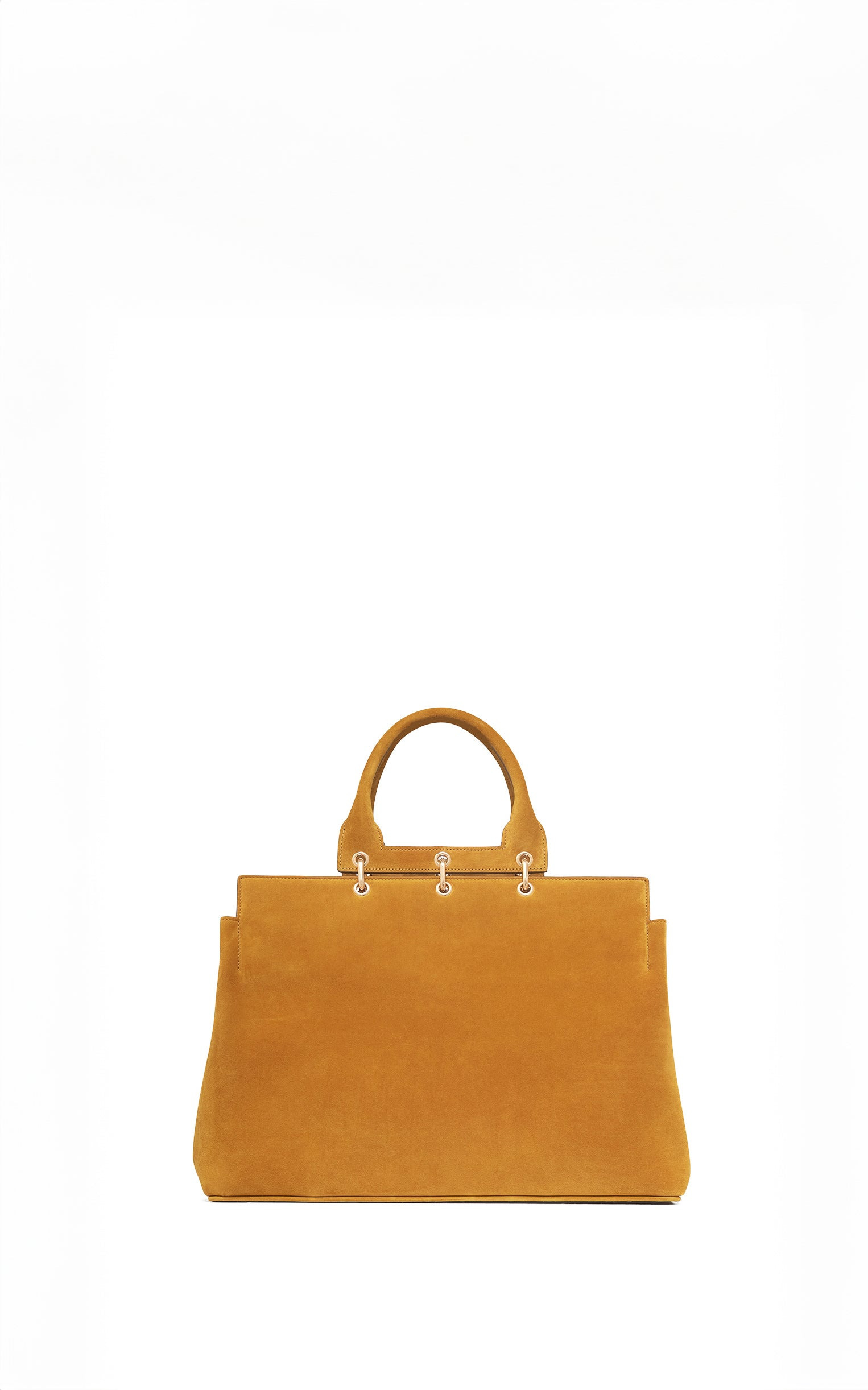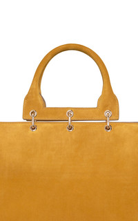 Crafted in suede, the small Amethyst Tote is designed for everyday structure and ease. The spacious interior includes a central zip pocket and two open compartments for effortless organization. Top handles and a detachable shoulder strap offer multiple ways to carry. Finished with gold-tone hardware and contrast edge detailing. Made in Italy. Details: - 100% Calf suede exterior - 90% Nappa leather. 10% Calf suede interior - Height: 8.5'' | 215.9mm - Length: 12.7'' | 322.58mm - Made in Italy