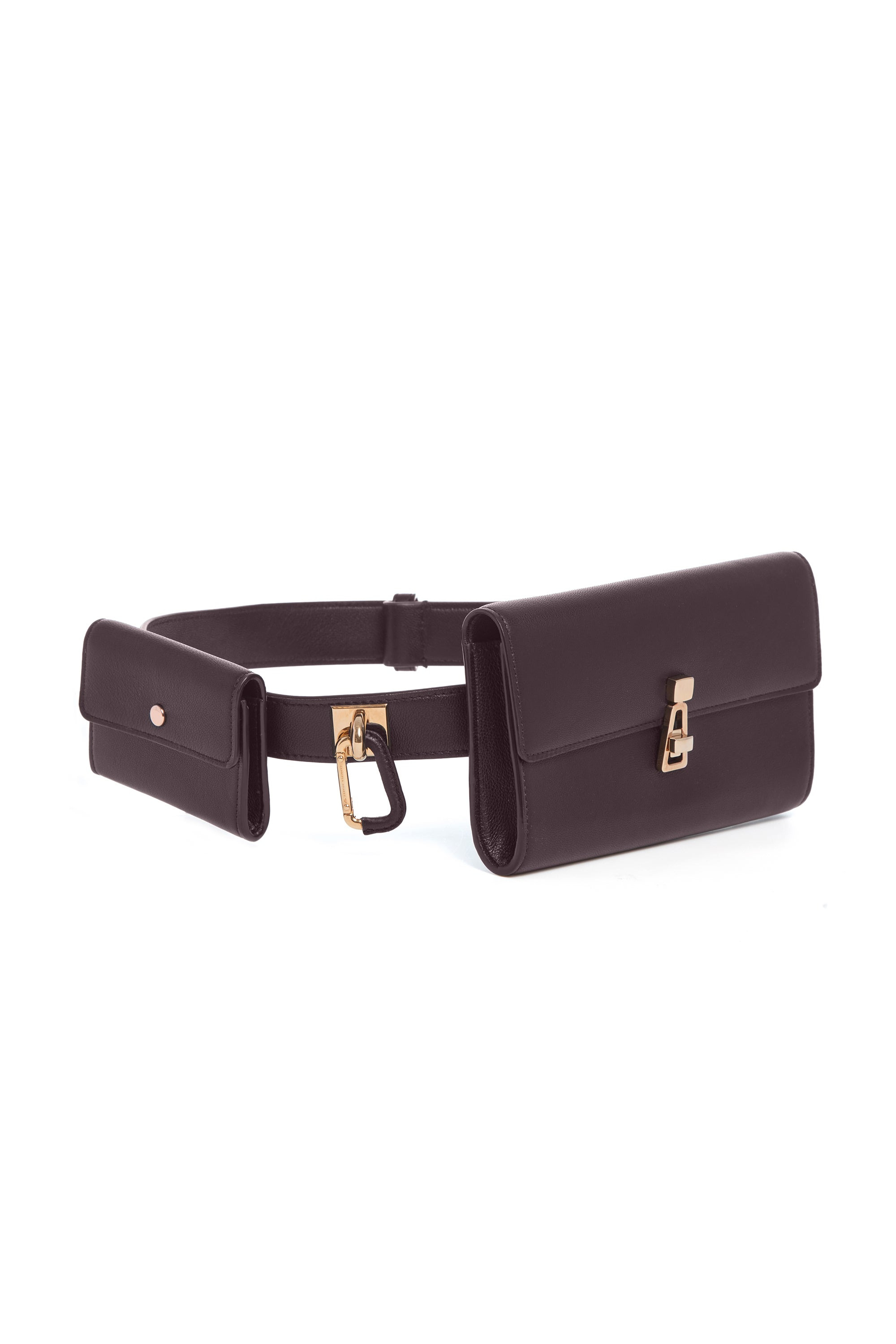 Crafted in smooth navy leather, this belt bag features two detachable compartments for everyday essentials. The larger pouch closes with a gold-tone clasp, while the smaller pocket has a snap closure. Finished with an adjustable strap, it can be worn at the waist or crossbody. Details: - 100% Calf Leather - 50% Calf Lining 50% Calf leather - 100% Metal brass hardware - Signature turnclock closure - One caravan clasp - Removable second pouch - Tonal stitch - Notch closure