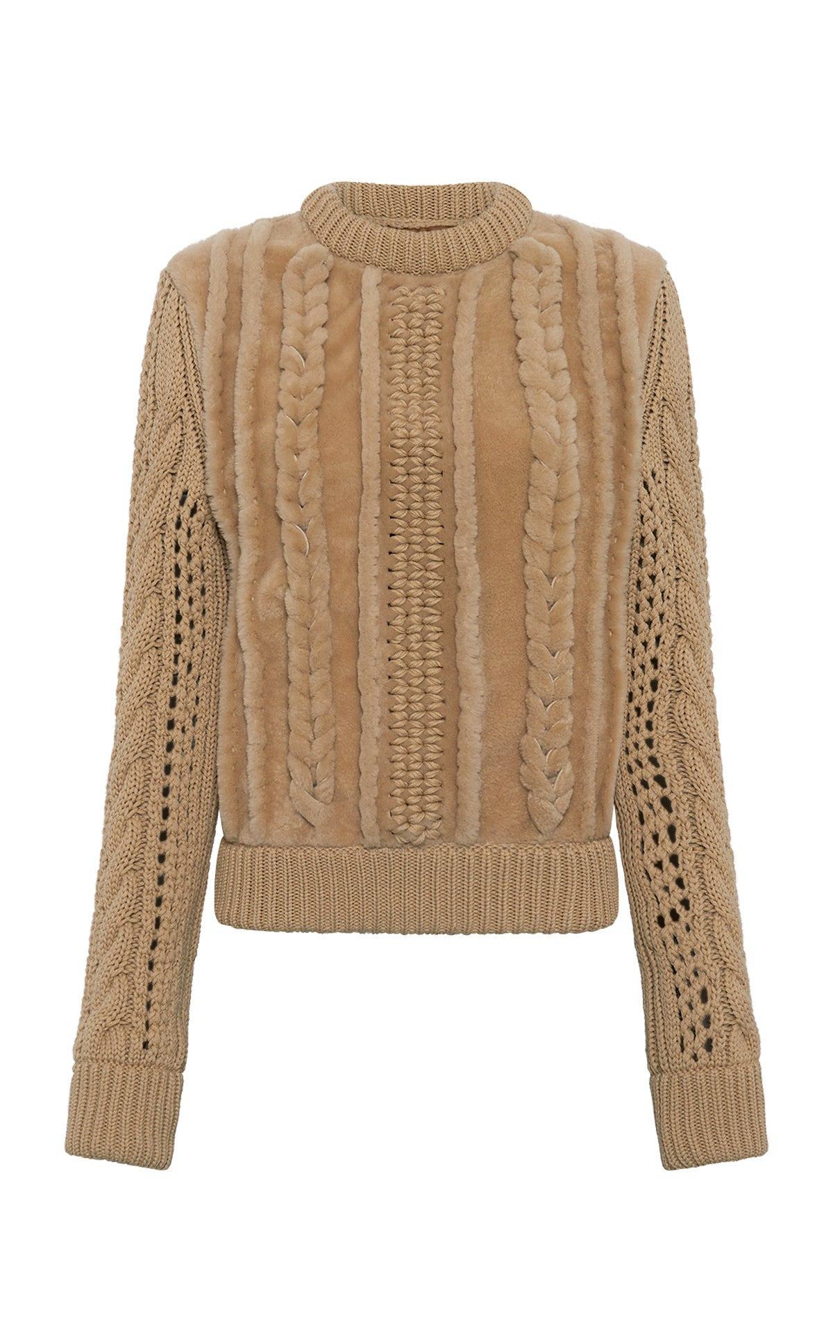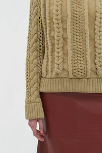 The Toth Pullover is made from hand-braided shearling with subtle cashmere embroidery, creating a rich, textured look. The sleeves are crafted in classic cable-knit cashmere, adding warmth and softness. Finished with ribbed trim at the neck, cuffs, and hem. Details: - 100% Lamb Ovis Aries | 100% Cashmere - Made in Italy