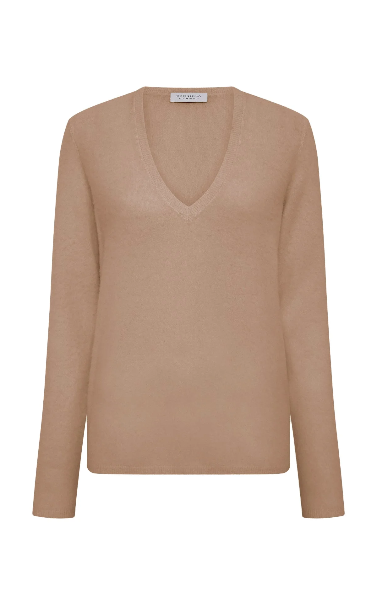 Vesper Knit V-Neck Sweater in Camel Brushed Cashmere