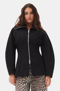 This Black Bonded Crepe Curve Sleeve Jacket features a full front zipper closure with a silver zipper, a high collar that can be worn up or folded down and a slit pocket on the chest. DETAILS - 100% recycled polyester. Learn more about our materials - Lining composition: 100% Recycled Polyester - High collar - Shaped sleeves - Zip closure - Front pocket Made in: China Product ID: F9608 SIZE & FIT - Designed for a regular fit - Marimar is 5’9” and wears a size US 4