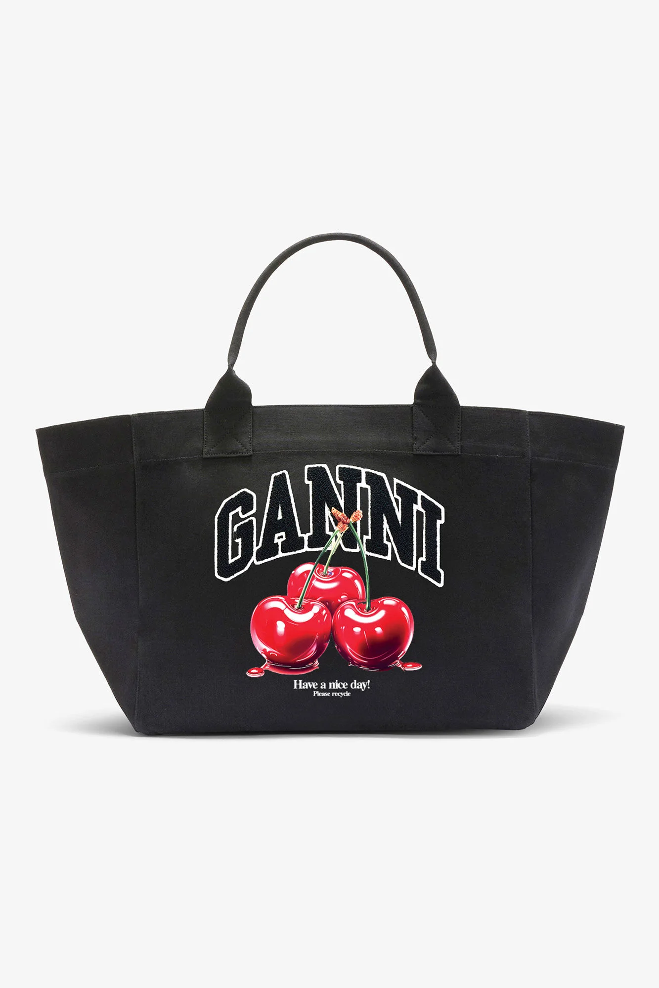 This tote bag features top handles, one large compartment, and a GANNI logo with the phrase 'Have a nice day! Please recycle'. DETAILS - 100% Recycled Cotton Learn more about our materials - Lining composition: 100% Recycled Cotton - Top handles - One compartment - GANNI logo - 'Have a nice day! Please recycle' message - Inner zipped pocket Made in: India Product ID: B2110037 SIZE & FIT - Height: 36 cm - Width: 19 cm - Depth: 65 cm - Designed to hold an iPhone 16 Pro Max, wallet, sunglasses, keys, water bottle, pouch, gym clothes, 15” laptop