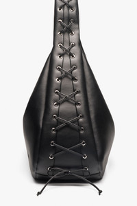 The Black XXL Hobo Bag is the silhouette of our Spring/Summer 2025 runway. Crafted with innovative materials, its oversized, slouchy shape is designed to be worn across the body or over the shoulder, featuring corseted lace-up accents, a mirror hangtag and silver-tone hardware. DETAILS - 65% recycled leather, 19% polyurethane fibre, 16% polyester. Learn more about our materials - Lining composition: 65% Recycled Cotton 35% Cotton - Shoulder strap - Zip closure - Tone-on-tone GANNI Butterfly logo - Corseted lace-up accents - Mirror hangtag Made in: China Product ID: A6639 SIZE & FIT - Strap length: 45 - Height: 38 - Width: 56 - Depth: 18