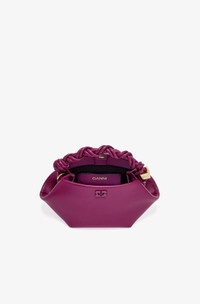 This Boysenberry Mini GANNI Bou Bag features a tone-on-tone metallic GANNI Butterfly logo, a twisted handle with a braided knot, and a gold-tone metallic dice with a GANNI Butterfly logo engraved. The bag has an internal magnetic closure, a flat card pocket inside, and an adjustable and removable shoulder strap for crossbody wear. DETAILS - 65% recycled leather, 19% polyurethane fibre, 16% polyester. Learn more about our materials - Lining composition: 65% Recycled Cotton 35% Cotton - Adjustable and removable shoulder strap - Tone-on-tone GANNI Butterfly logo - GANNI embossed logo on the back of the bag - Braided top handle with a braided knot - Metallic dice with a GANNI and Butterfly logo engraved - Internal magnet closure - One compartment - Flat card pocket inside Made in: China Product ID: A6511 SIZE & FIT - Strap length: 50 - Height: 11 - Width: 25 - Depth: 11.5