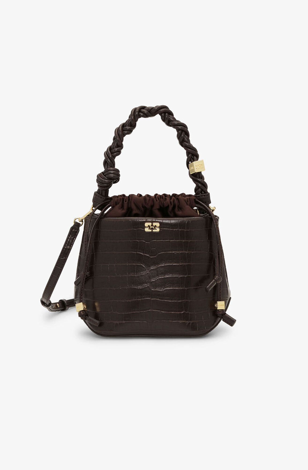 This bag is crafted in a croc-embossed material and features a braided top handle with knot detail and an adjustable and removable strap. The bag has a drawstring pouch, an embossed logo on the back, and an internal flat pocket. DETAILS - 51% recycled leather, 23% TENCEL™ Lyocell, 26% polyurethane. Learn more about our materials - Lining composition: 100% Recycled Polyester - Croc-embossed material - Structured silhouette - Braided top handle with a braided knot - Adjustable and removable shoulder strap - Drawstring closure - Non-removable black pouch - Gold-tone metallic dice with a GANNI logo - GANNI embossed logo - Flat card pocket Made in: China Product ID: A6697 SIZE & FIT - Strap length: 50 - Height: 18 - Width: 18.5 - Depth: 13