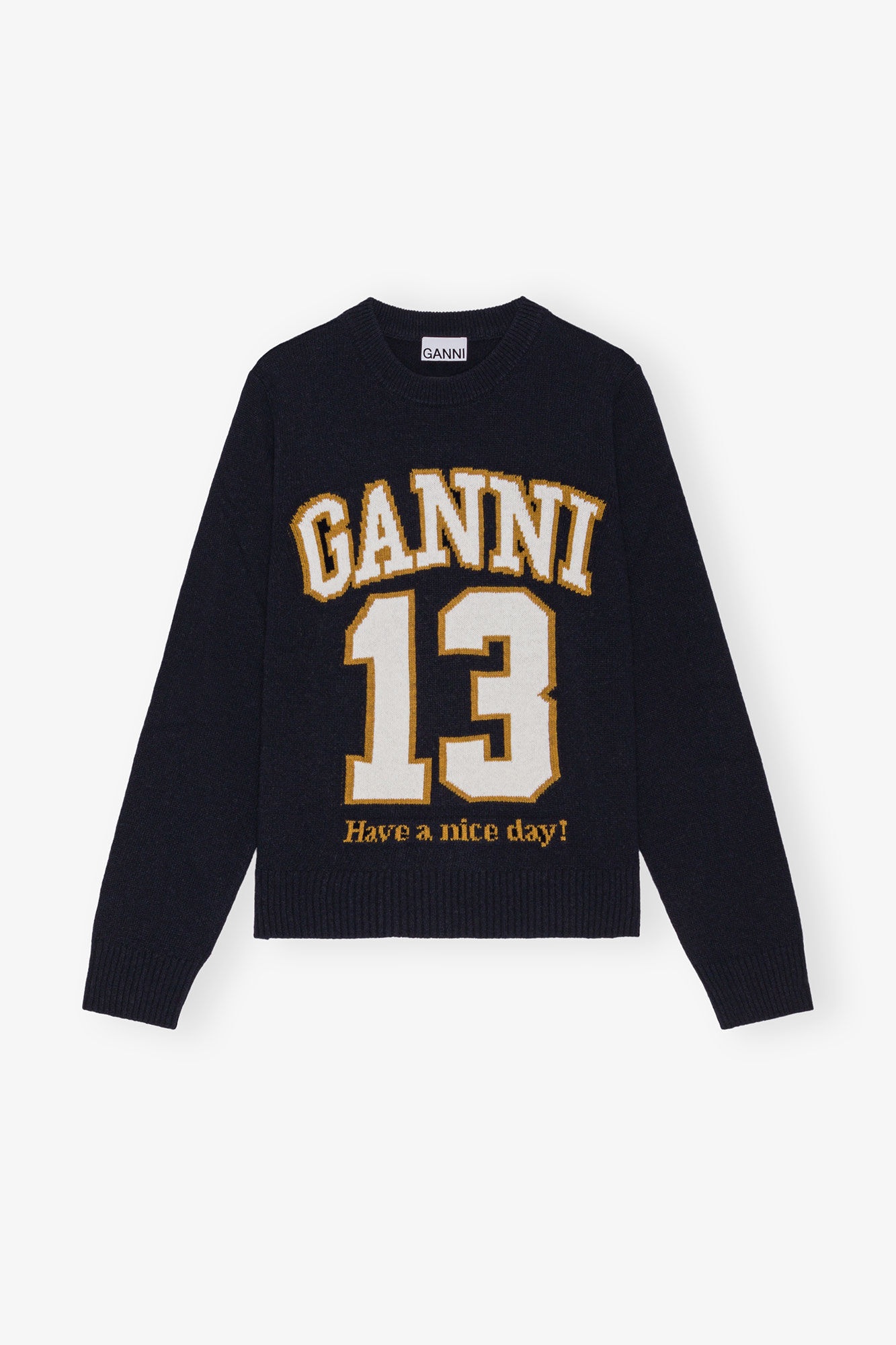 This Dark Blue Graphic Wool Mix Baseball Sweater features a round neckline, a graphic GANNI motif, long sleeves and ribbed edges. DETAILS - 45% wool, 35% recycled wool, 20% recycled polyamide. Learn more about our materials - Round neckline - Long sleeves - Ribbed edges - Graphic GANNI motif Made in: Romania Product ID: K2427 SIZE & FIT - Jenny is 5’10” and wears a size S