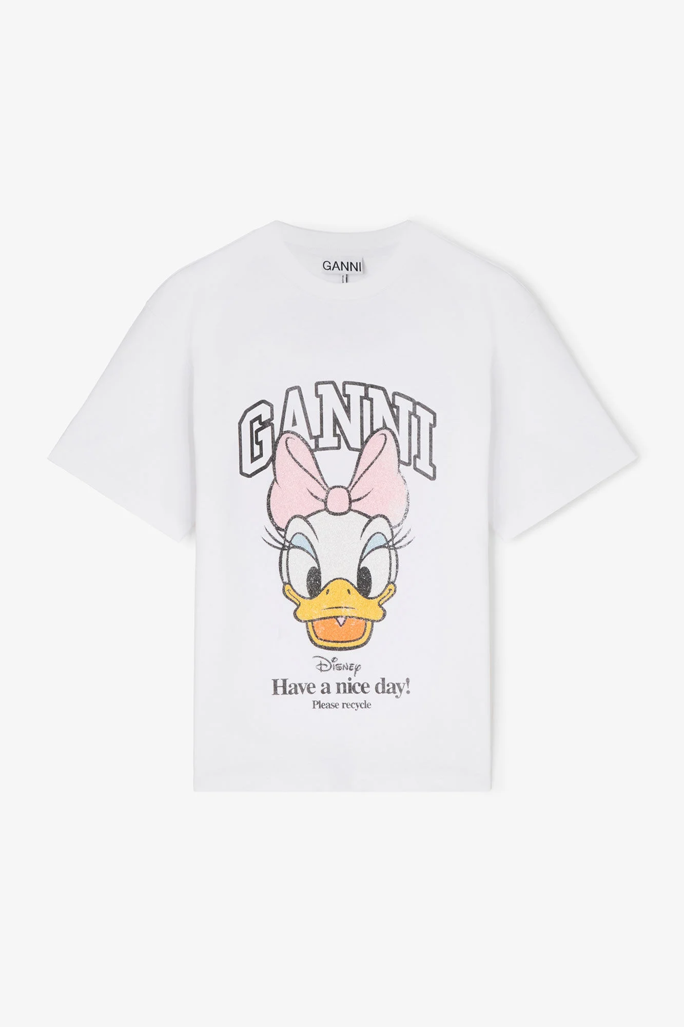 This T-shirt features a round neckline, short sleeves and a Daisy Duck print. DETAILS - 100% Organic Cotton Learn more about our materials - Vintage look - Round neckline - Short sleeves - Disney's Daisy Duck sparkly character print - GANNI and Disney logo - 'Have a nice day! Please recycle' message Made in: Portugal Product ID: A1050133 SIZE & FIT - Slim fit