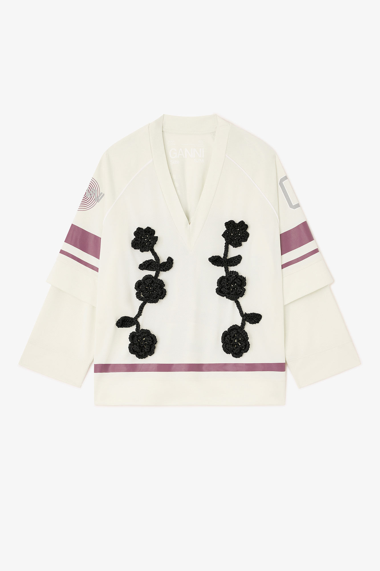This top features a V-neckline, long sleeves and flower crochet detailing. DETAILS - 70% polyester, 30% recycled polyester (Cycora®) . Learn more about our materials - V-neckline - Long sleeves - Flower crochet detailing This style contains cycora®. cycora® is turning the textiles of the past into the clothing of the future. Made entirely from textile waste, using advanced molecular regeneration technology, textiles are broken down to the molecular level and transformed into cycora® yarns. cycora® is part of GANNI’s Fabrics of the Future, a programme set up in 2019 by GANNI to research, test and eventually scale innovative materials that challenge conventional material methods, paving the way for the future of fashion. Made in: China Product ID: T4404 SIZE & FIT - Oversized fit - Yaniris is 5’11” and wears a size S/M - For personalised guidance on sizing and fit, contact our Customer Service team - here - .