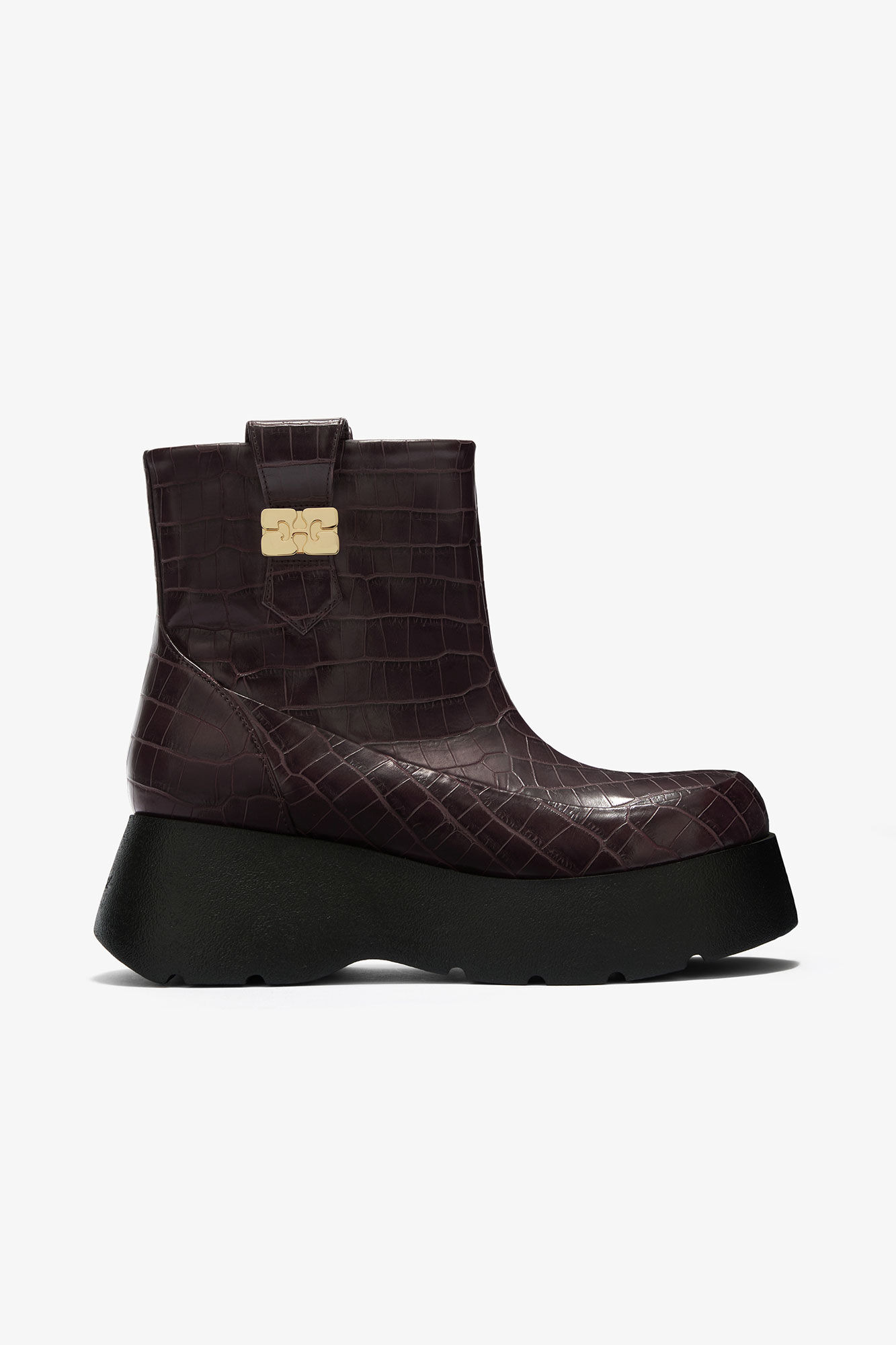 These boots feature a round toe, platform sole, pull tabs and a GANNI butterfly logo. DETAILS - 51% recycled leather, 26% polyurethane, 23% TENCEL™ . Learn more about our materials - Round toe - Platform sole - Pull tabs - GANNI Butterfly logo This style contains PELINOVA®. PELINOVA® is bringing a fresh perspective to leather by reclaiming leather scraps from the fashion and upholstery industries and blending them with TENCEL™ Lyocell, to create a recycled leather material that reduces reliance on virgin resources—without compromising on quality. PELINOVA® is part of GANNI’s Fabrics of the Future, a programme set up in 2019 by GANNI to research, test and eventually scale innovative materials that challenge conventional material methods, paving the way for the future of fashion. Made in: Portugal Product ID: S3235