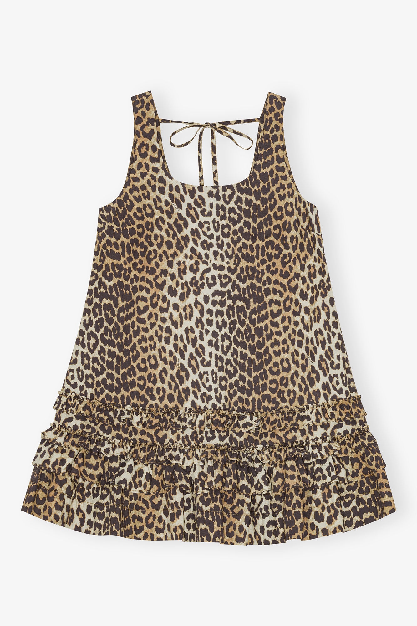 This mini dress features a U-neckline, a ruffled hem and an open back with a tie closure. DETAILS - 100% organic cotton. Learn more about our materials - Leopard print design - U-neckline - Sleeveless design - Open back - Adjustable back tie closure - Ruffled hem Made in: India Product ID: W0906 SIZE & FIT - Slim fit - Kathia is 5’10” and wears a size US 4