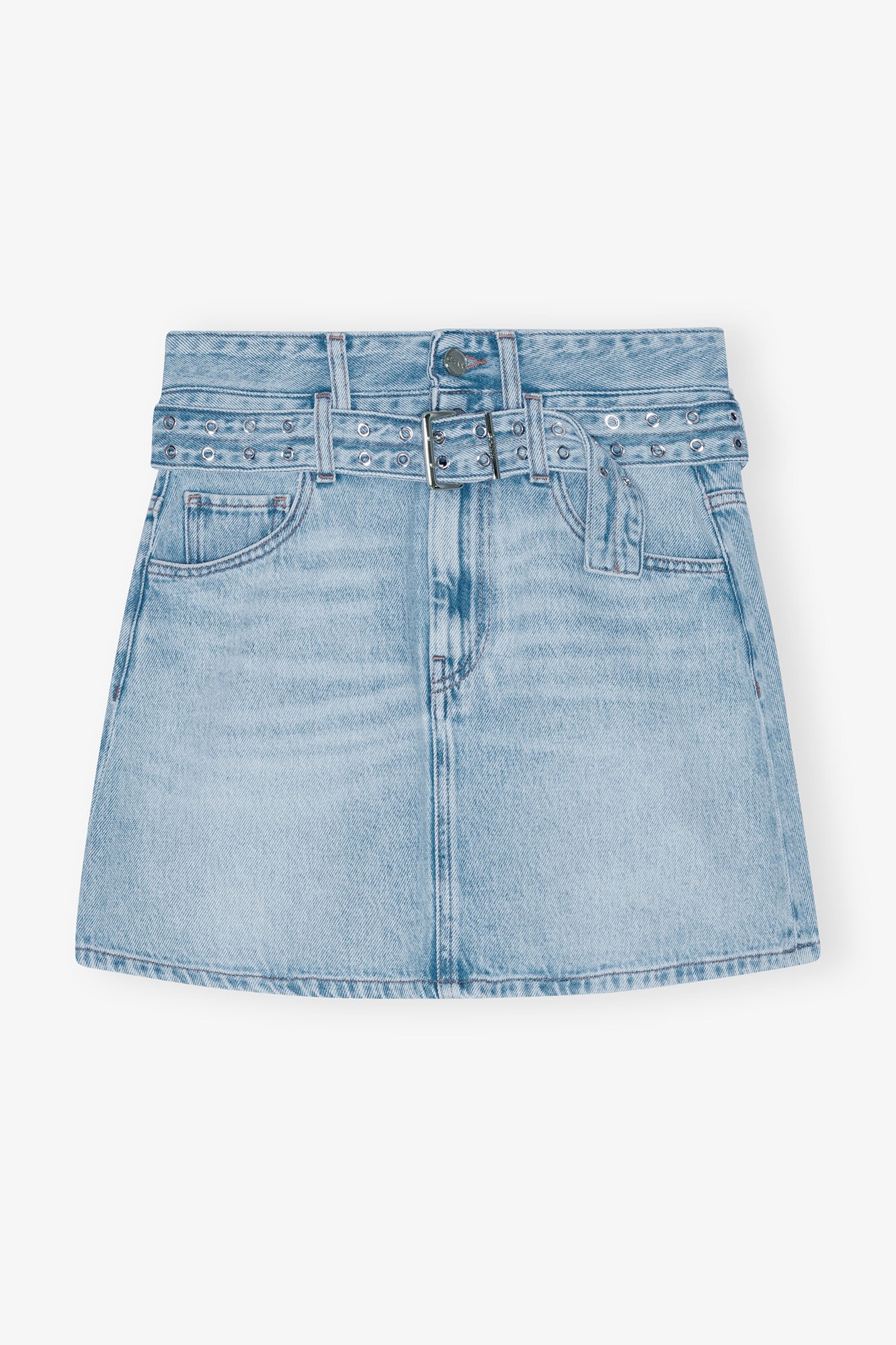 This skirt is crafted from light blue denim with a stone-washed finish, featuring a double belt with metallic eyelets. It has a classic five-pocket design and a front zip and button closure. DETAILS - 60% organic cotton, 40% TENCEL™ Lyocell. Learn more about our materials - Light blue stone-washed denim - Button and zip closure - Belt loops - 5 pockets - GANNI logo at the back pocket - Double belt with metallic eyelets Made in: Tunisia Product ID: J1744 SIZE & FIT - Slim fit - Mini length - Kathia is 5’10” and wears a size US 4