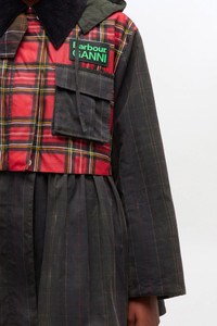 Inspired by a design from the 2023 GANNI x Barbour Recut Project, this GANNI x Barbour jacket features a detachable hood, a large collar, elbow-patched sleeves, and front patch pockets. It includes a detachable peplum hem for versatile styling and is finished with a GANNI x Barbour logo patch. DETAILS - 100% cotton Learn more about our materials - Tartan print - Detachable hood with adjustable drawstrings - Large courderoy collar - Button closure - Concealed zip closure - Windstopper sleeves with elbow patches - Pockets: 2 cargo patch pockets - Detachable peplum hem - Hardware: Silver - GANNI x Barbour logo patch - Tartan lining Made in: Moldova Product ID: W0925 SIZE & FIT - Regular fit