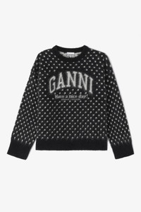 This sweater features a round neckline, long sleeves, ribbed edges, a polka print and a GANNI logo. DETAILS - 50% Alpaca, 28% Polyamide, 22% Wool Learn more about our materials - Round neckline - Long sleeves - Ribbed edges - Polka print graphic - GANNI logo - 'Have a nice day! Please recycle' message Made in: Romania Product ID: A1070123 SIZE & FIT - Oversized fit - Lisa Lu is 5’10” and wears a size S