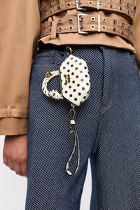 This Polka-Dot Nano GANNI Bou Bag features a tone-on-tone metallic GANNI Butterfly logo, a twisted handle with a braided knot, and a gold-tone metallic dice with a GANNI Butterfly logo engraved. The bag has a zipper closure at the top and a removable wrist strap. The bag is suitable for small essentials like keys, coins, or lip balm. DETAILS - 65% recycled leather, 19% polyurethane fibre, 16% polyester. Learn more about our materials - Lining composition: 65% Recycled Cotton 35% Cotton - Braided strands with a braided knot - Removable wrist strap - Zip-around closure - Tone-on-tone GANNI Butterfly logo - GANNI embossed logo on the back of the bag - Metallic dice with a GANNI and Butterfly logo engraved Made in: China Product ID: A6614 SIZE & FIT - Strap length: 52 - Height: 9.5 - Width: 12 - Depth: 2.5