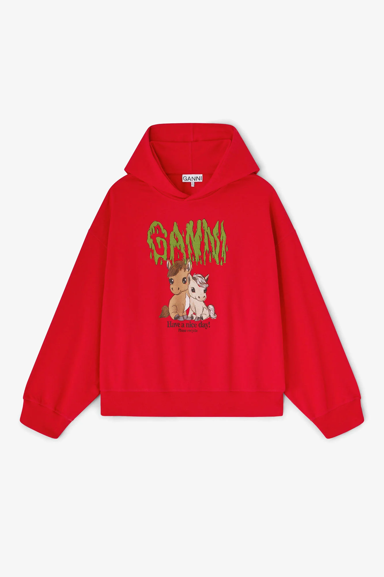 This hoodie features a hooded neckline, long sleeves, a printed pony illustration, and a GANNI logo DETAILS - 100% Organic Cotton Learn more about our materials - Jersey material - Round neckline - Hood - Long sleeves - Ribbed edges - Printed pony illustration - GANNI logo - 'Have a nice day! Please recycle' message Made in: Portugal Product ID: A1060021 SIZE & FIT - Relaxed fit - Cropped silhouette - Lisa Lu is 5’10” and wears a size S